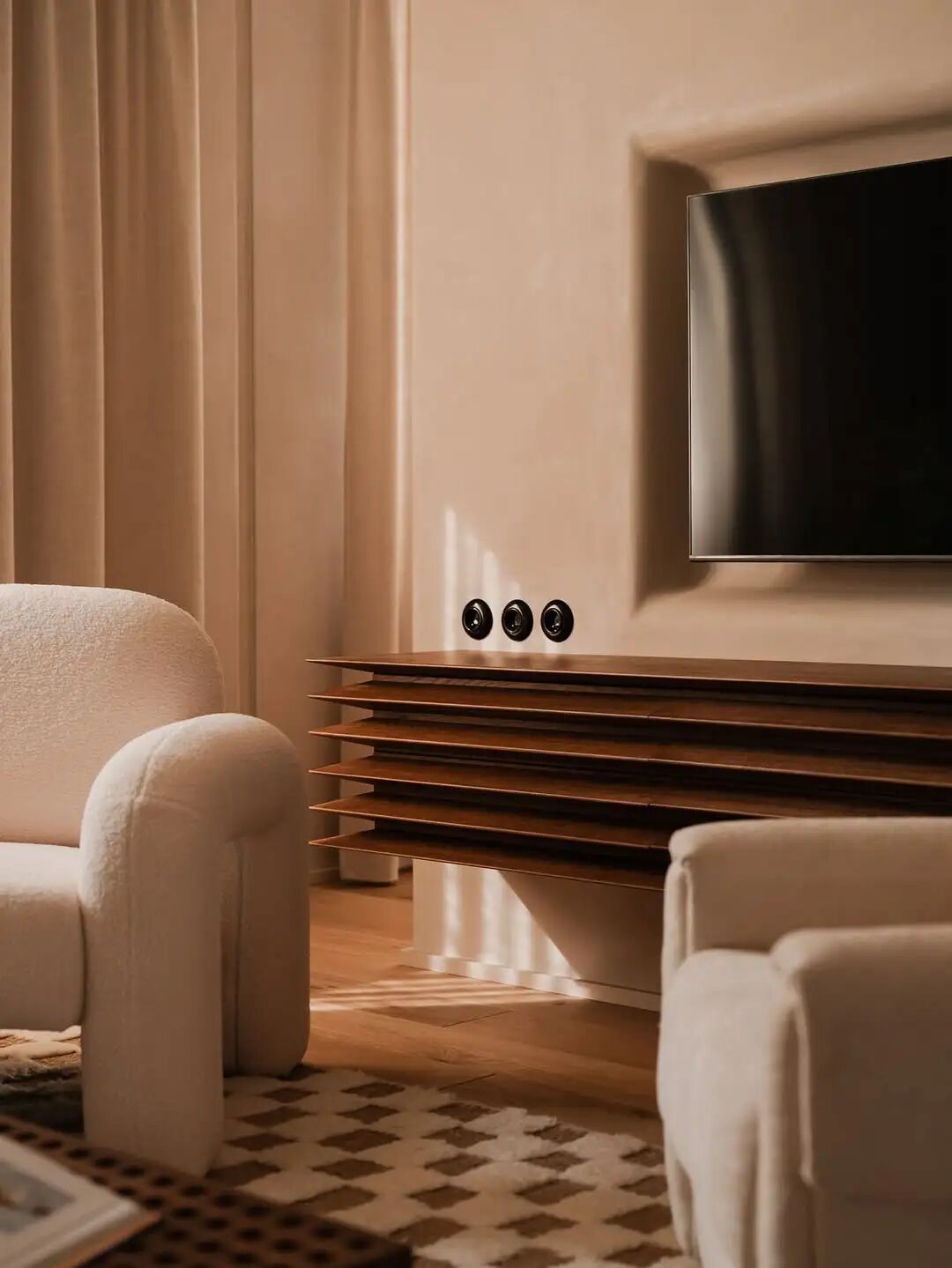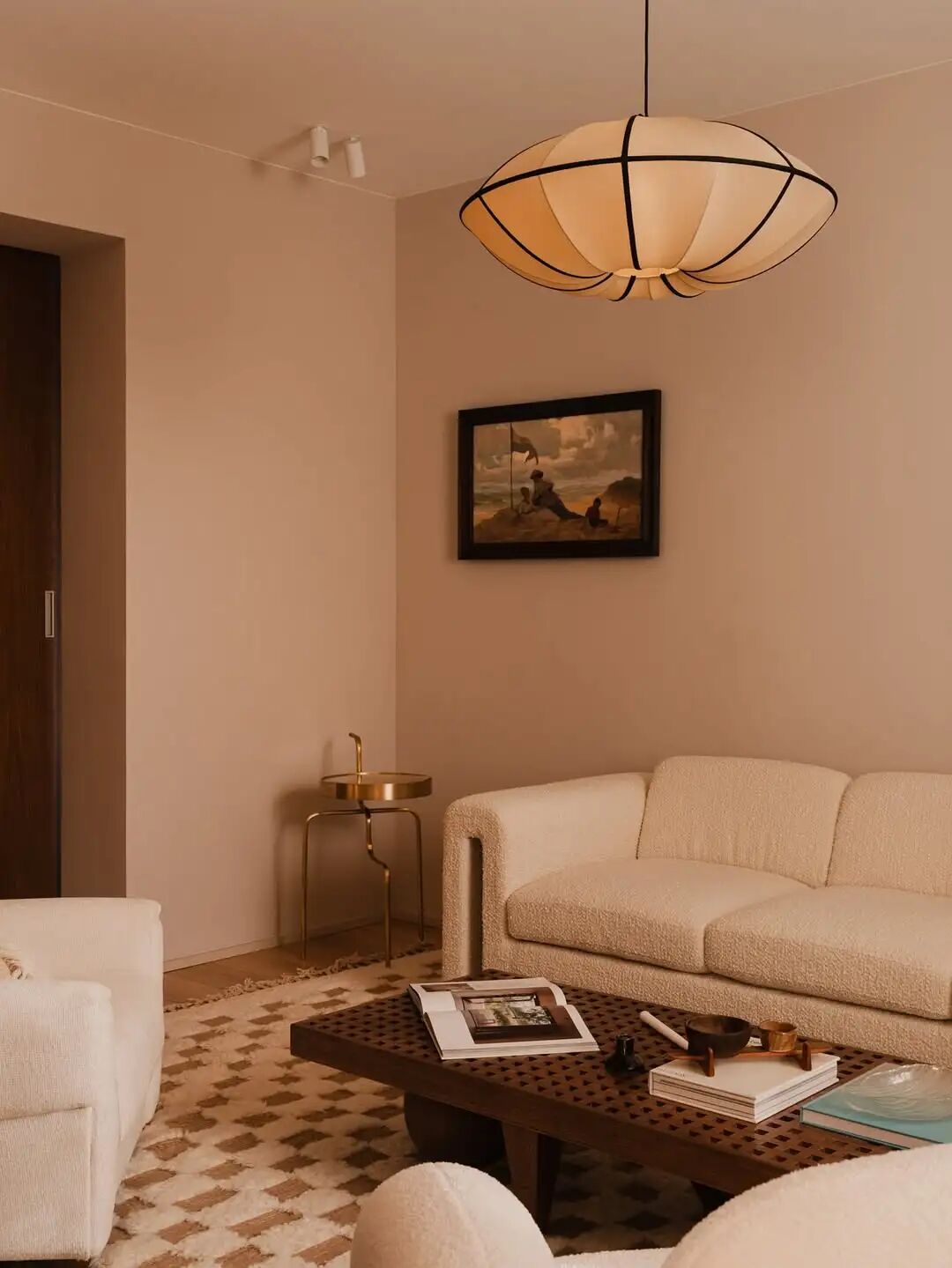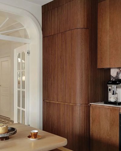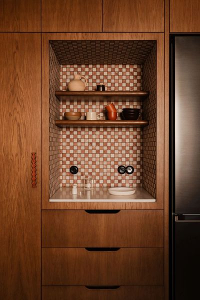 胡桃木家具为空间增添了深邃感,同时平衡了米色系列柜体的明亮度。嵌入柜体中的咖啡角成为一处装饰亮点,其表面采用米棕棋盘格纹大理石马赛克铺贴,为空间注入兼具私密性与匠心感的细腻质感。