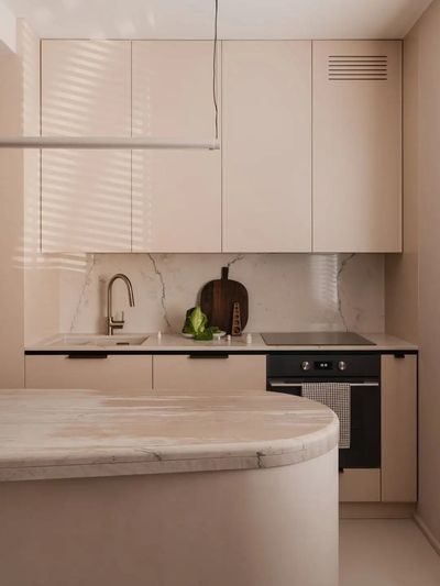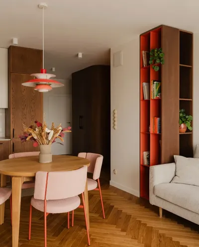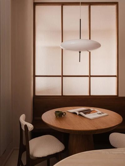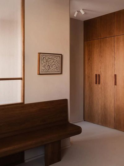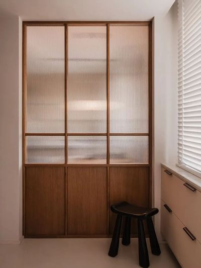 设计师充分利用了公寓 “双面采光” 的优势,让自然光能够毫无阻碍地洒满整个空间。一进门便会看到一面半透明的装饰玻璃屏风,玻璃与木材结合的柜体在划分功能区域的同时,并未破坏空间的整体感,且与厨房雕花台面形成呼应。