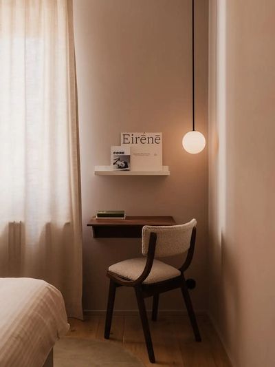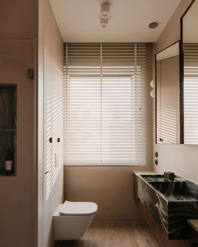 浴室同样延续了这一色彩和谐感,局部以绿色石材洗手台作为点缀 —— 这一设计不仅是色彩亮点,也让空间与自然元素产生关联。