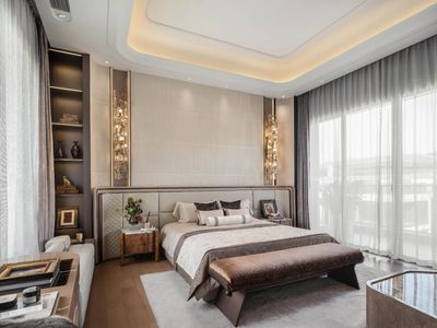 - 这套别墅样板空间的设计,从前期的深化设计(反复雕琢每一处细节),到后期软装选品(甚至小到一枚五金件的质感把控),全程以“无界奢华”为核心逻辑。设计师团队深入全球供应链,确保意大利奢石、定制艺术家具等资源的精准落地,让业主“所见即所得”。