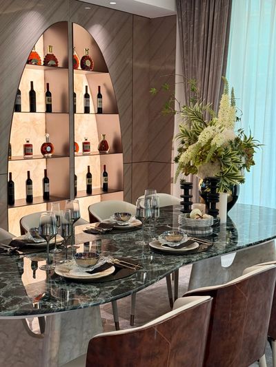 以“普拉达绿的奢华贵族感奢石餐桌 沉淀内敛式的树瘤餐椅”组合,既满足高规格家宴的社交需求,又以材质碰撞营造出“奢华烟火气”。