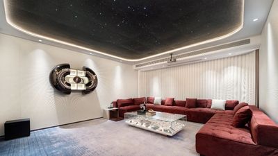 以星空顶营造梦幻氛围,红色绒面沙发打造舒适社交场,艺术感十足的装置与透明茶几形成材质碰撞,在功能与美学间达成精妙平衡。