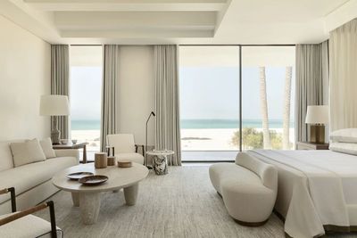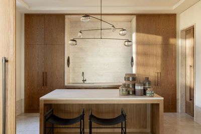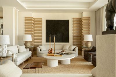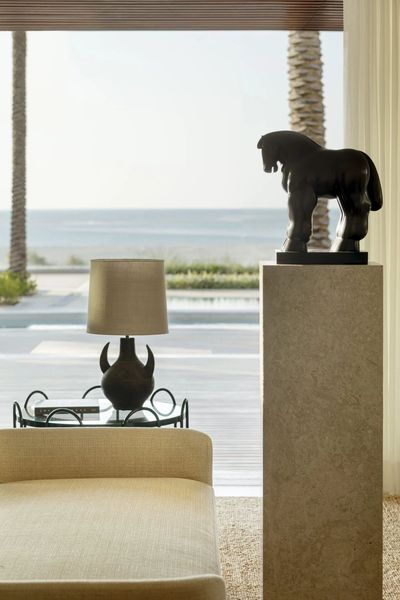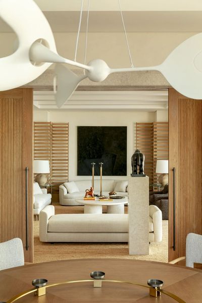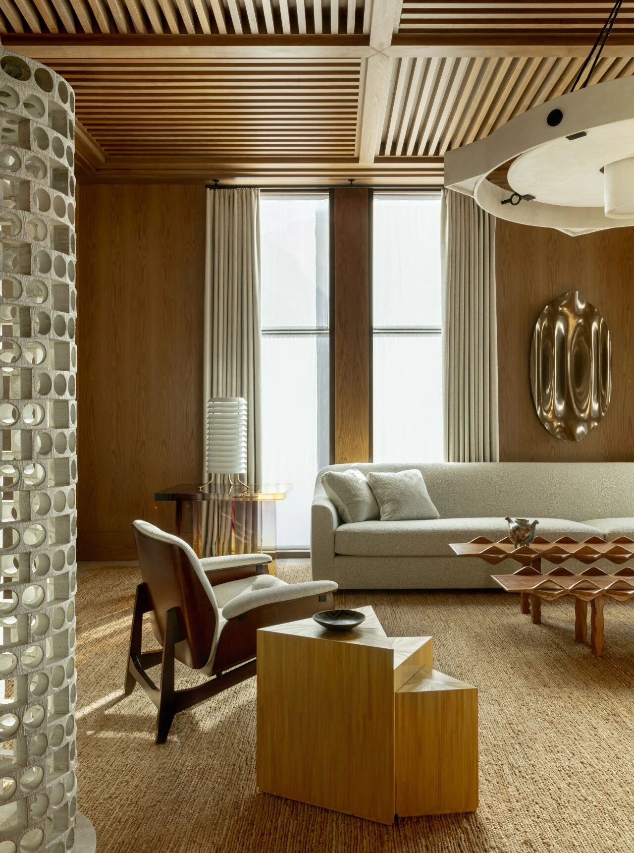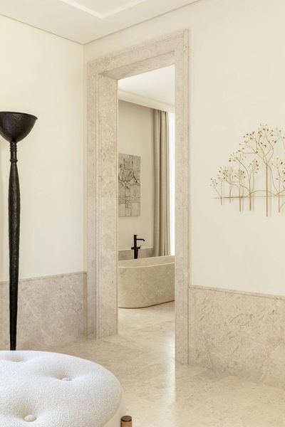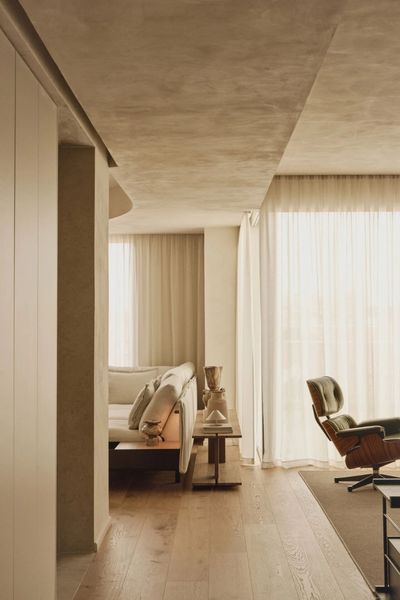 The wooden spiral staircase creates a striking contrast with the natural stone flooring, highlighting the spatial layers while enriching the tactile experience. Carefully selected decorative soft furnishings perfectly complement the overall space, giving it a refined elegance within a subtle color palette. Light and shadow play across the different materials, infusing the space with warmth and rhythm, allowing one to feel both tranquility and the delicate sophistication of the design.