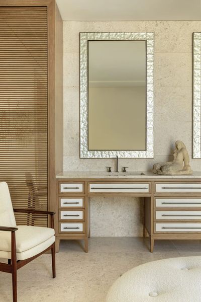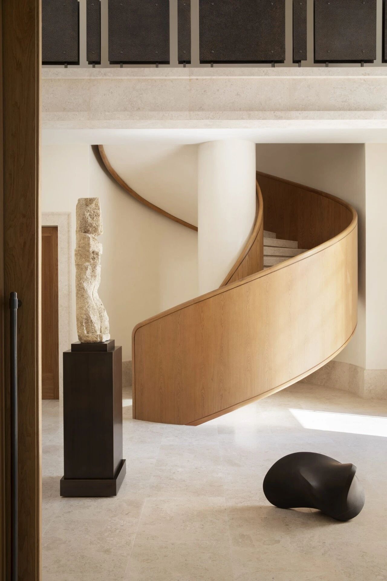 木制旋转楼梯与天然石材地面形成鲜明的材质对比,既凸显了空间的层次感,又增添了触感的丰富性。装饰性软装经过精心挑选,与整体空间完美呼应,使空间在淡雅色调中展现高级感。光影在不同材质表面流动,赋予空间温度与韵律,让人既感受到宁静,又体验到设计的细腻与格调。