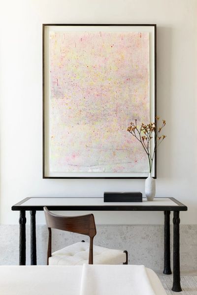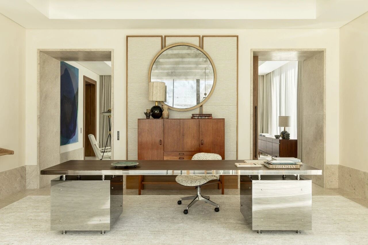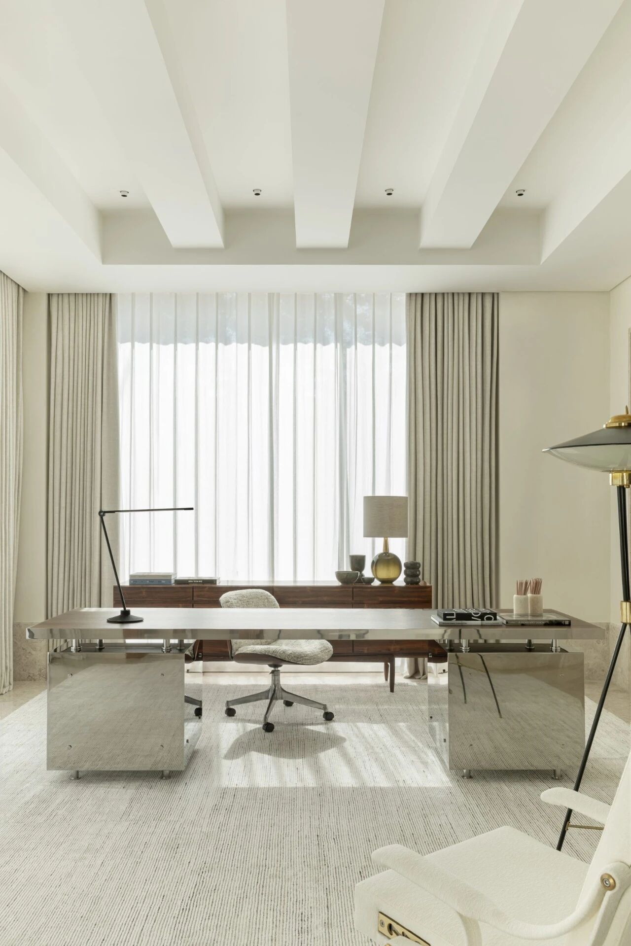 书房内的这张镜面不锈钢书桌极具前卫感,其光亮表面在空间中反射出独特的现代气息。为了保持整体空间的秩序与协调,设计师特别搭配了一只深色木制五斗柜,使金属的冷感得以柔和过渡,同时为空间增添了温润的质感与层次感。书桌与五斗柜的材质与色彩对比巧妙呼应,既保证了功能性,也让整个书房呈现出理性与感性并存的平衡美学。