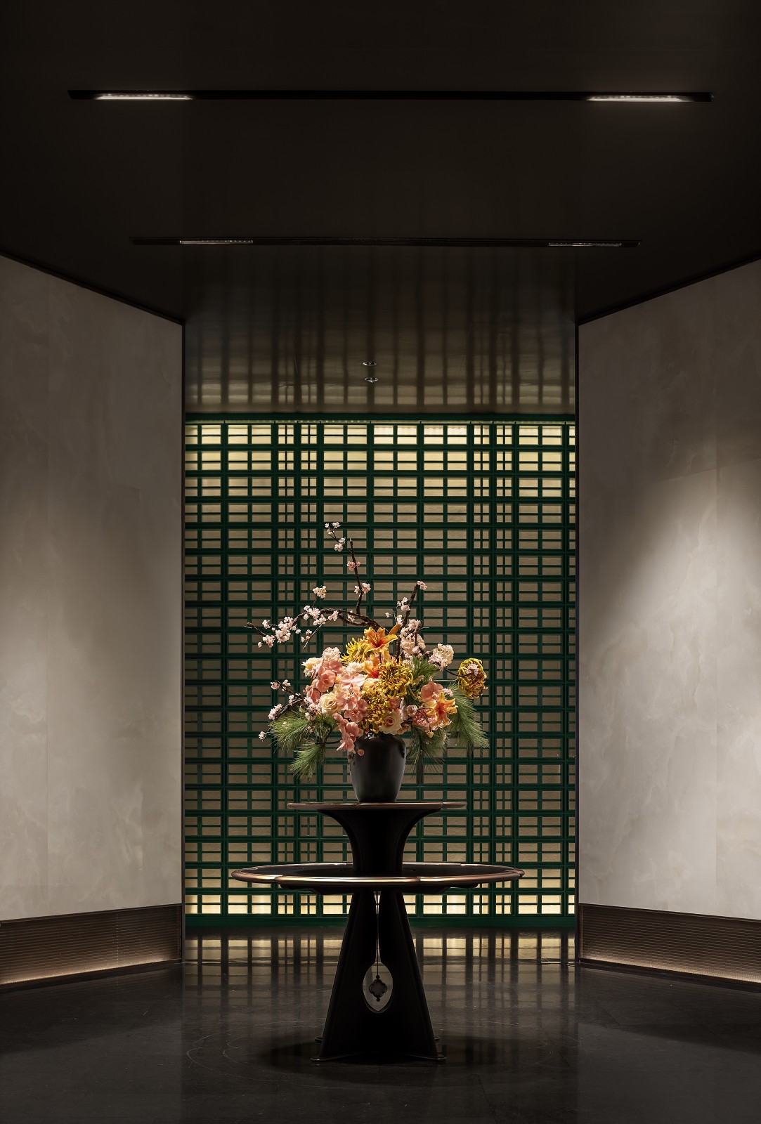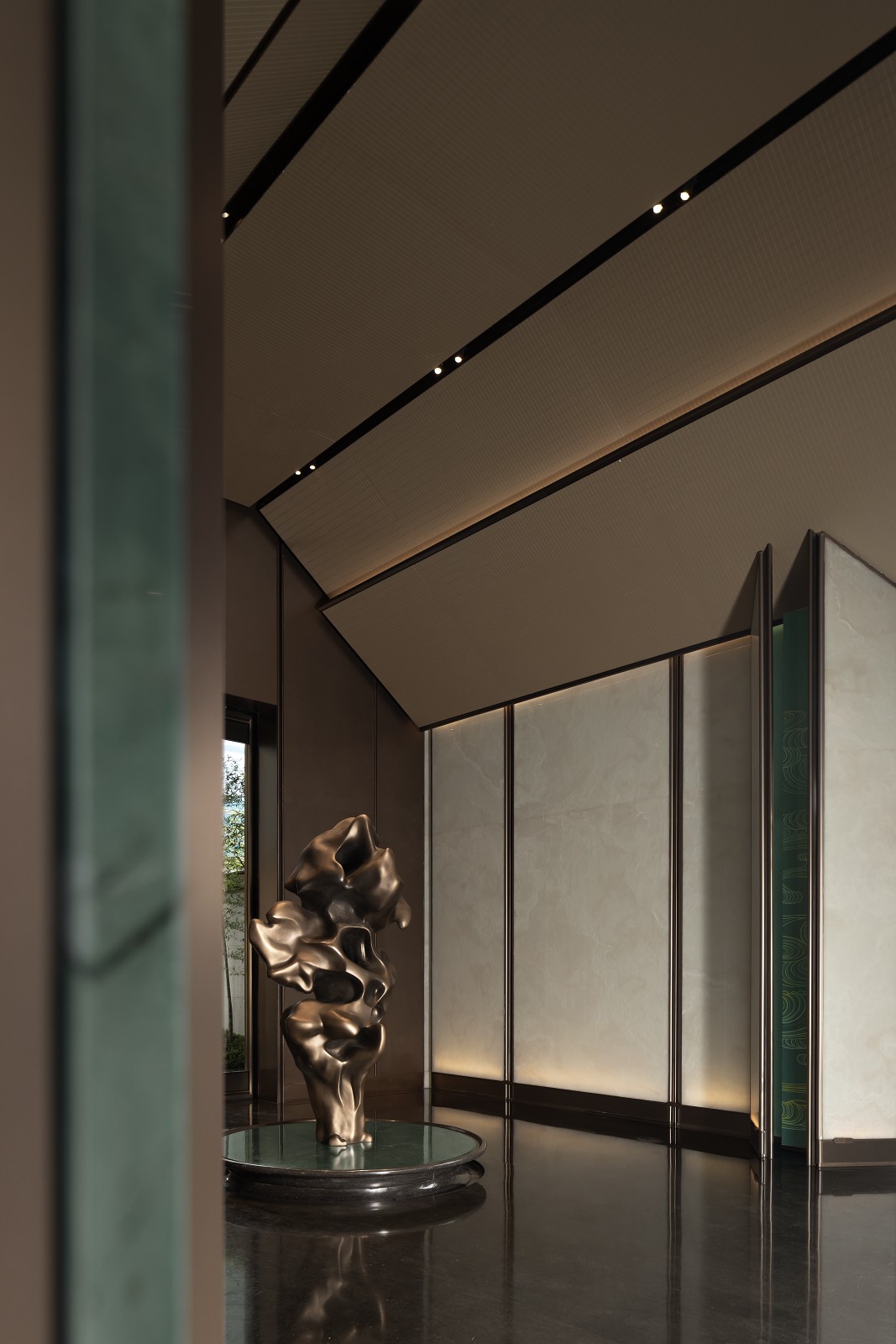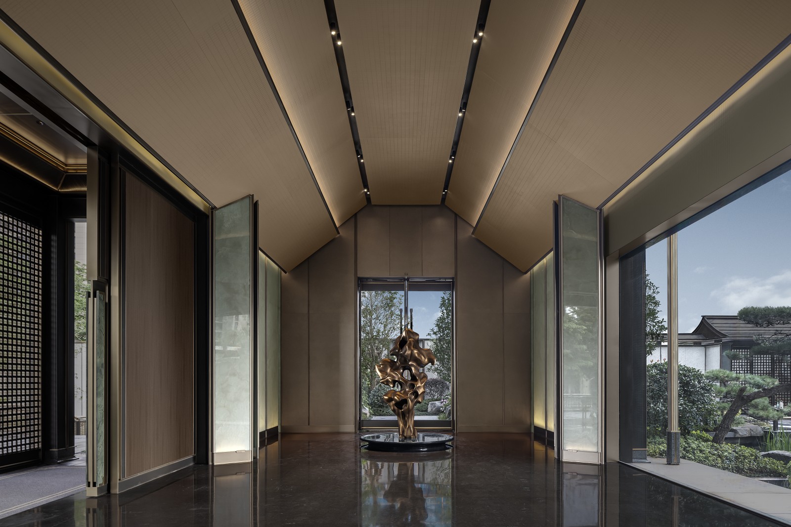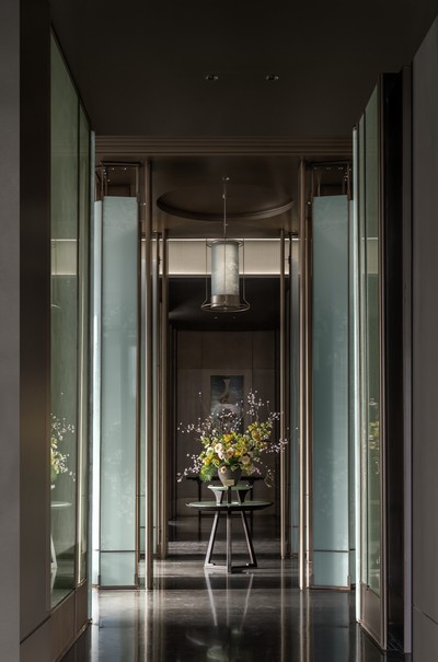 礼仪门廊空间以中正的对称布局及开敞的空间尺度,带来酒店礼遇般的新归家主张。空间中采用了宋韵文化符号,融入璞悦的元素,呈现非凡与独特璞悦气质及高定奢华的尊贵体验。