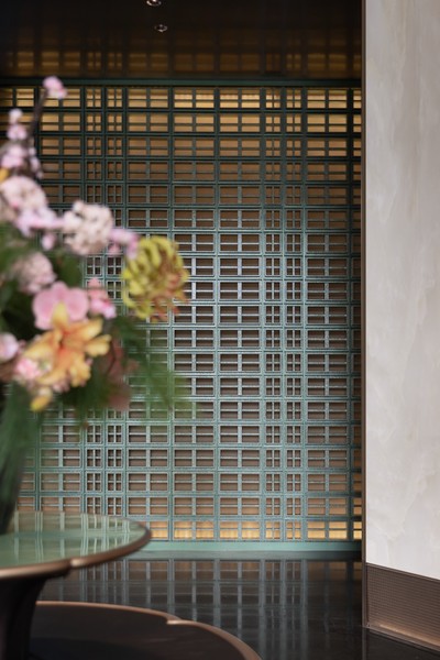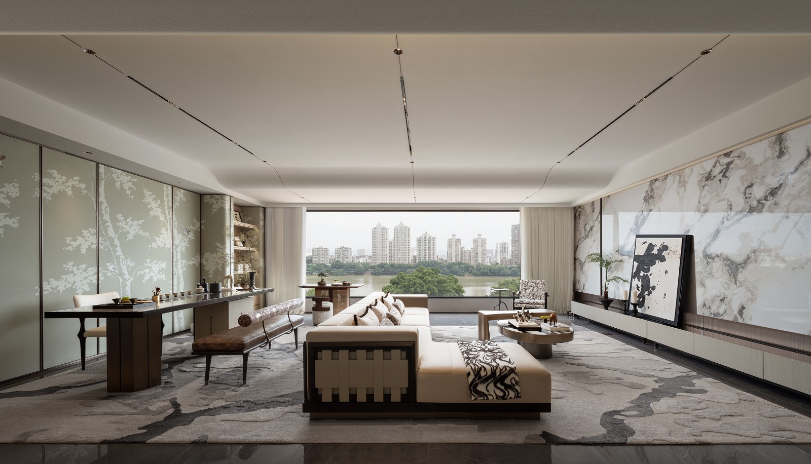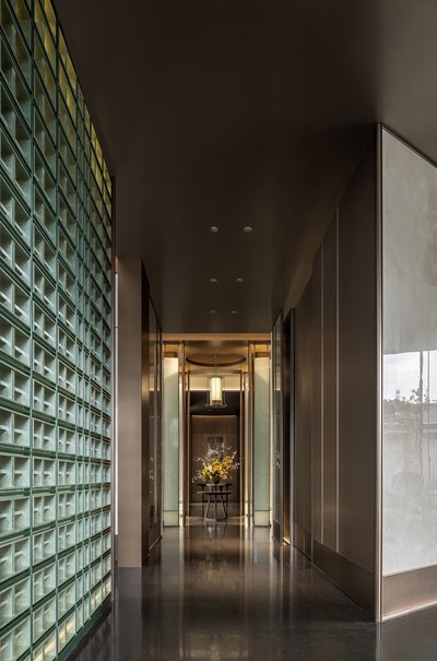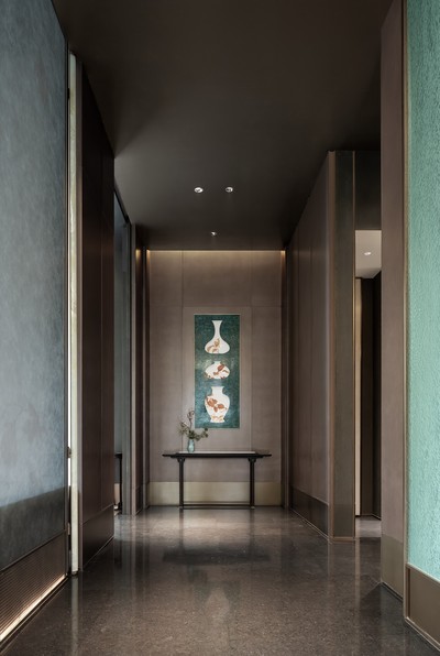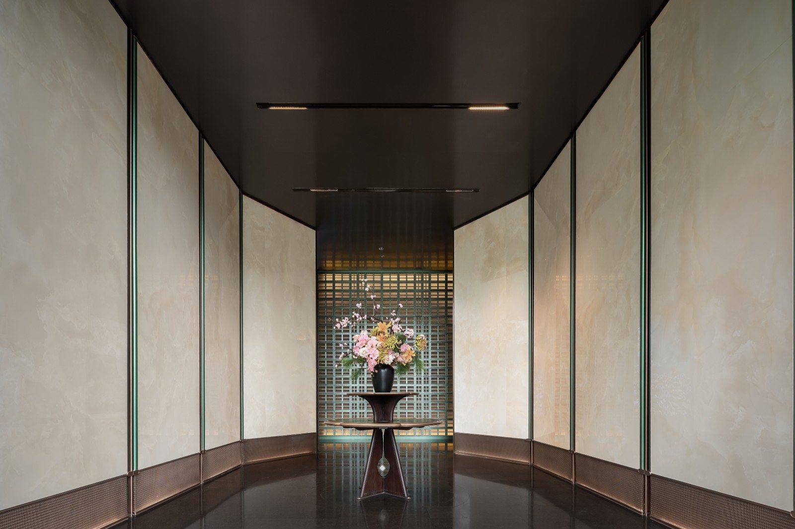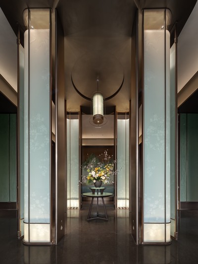 礼仪门廊空间以中正的对称布局及开敞的空间尺度,带来酒店礼遇般的新归家主张。空间中采用了宋韵文化符号,融入璞悦的元素,呈现非凡与独特璞悦气质及高定奢华的尊贵体验。