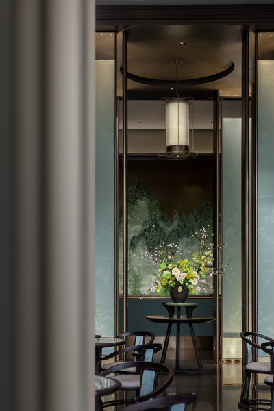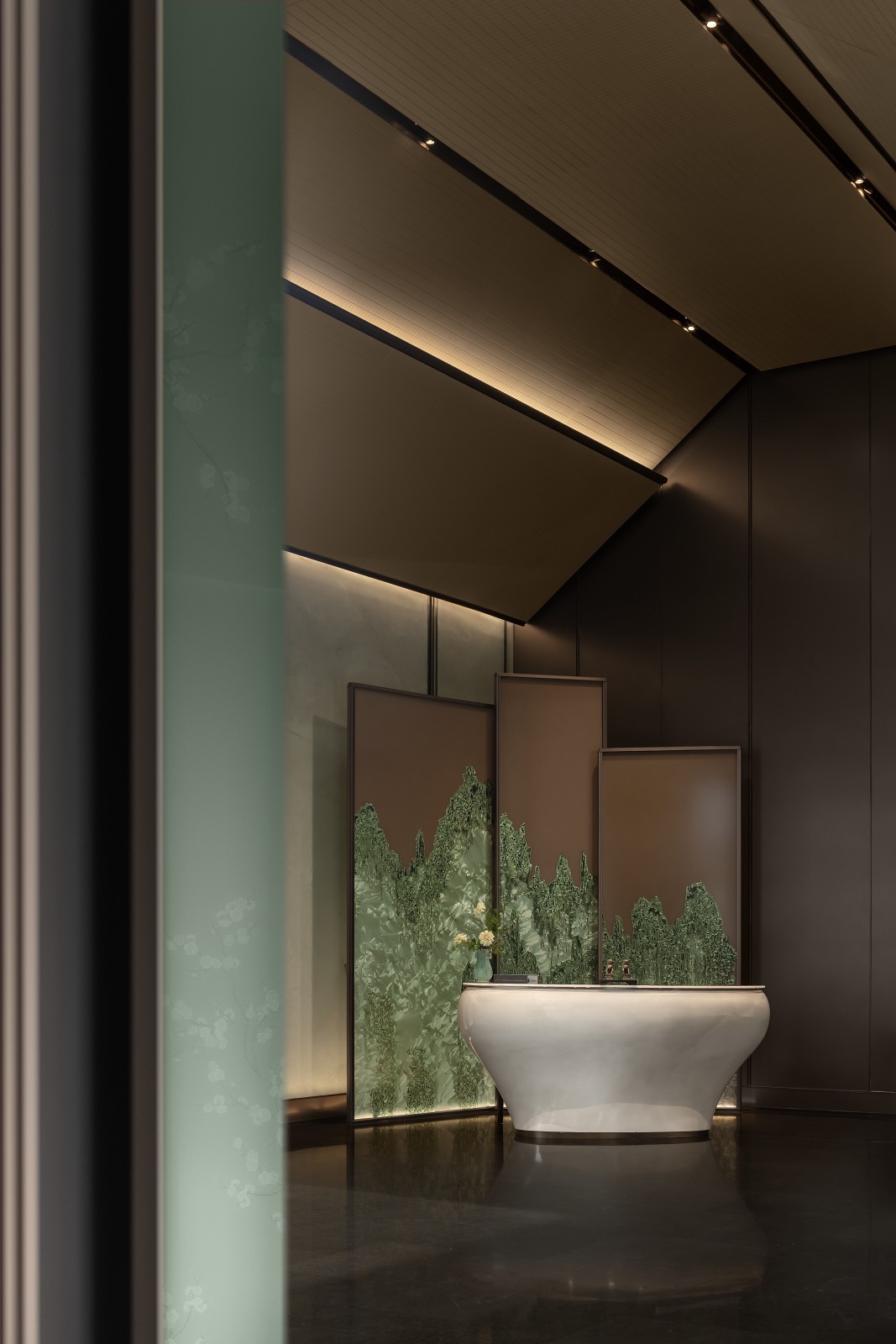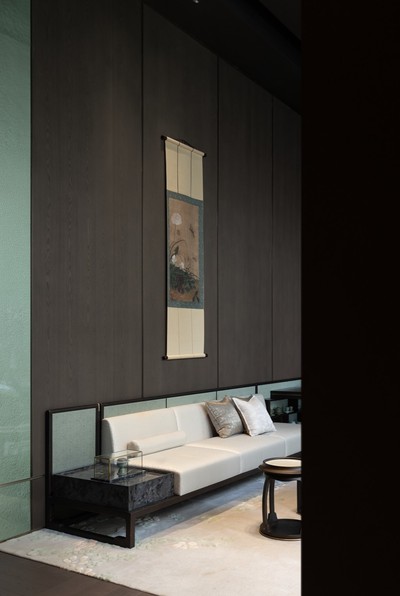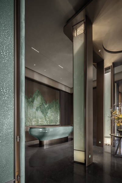 屏其风也,以木为骨。屏风提取《千里江山图》中的青绿山水,取其青绿之色,融入空间中。以现代手法感悟自然风物之美。