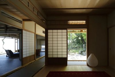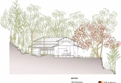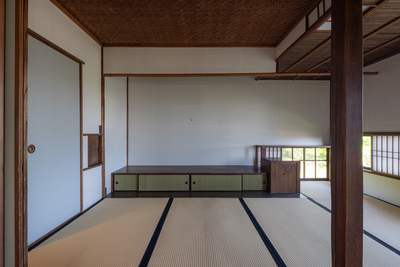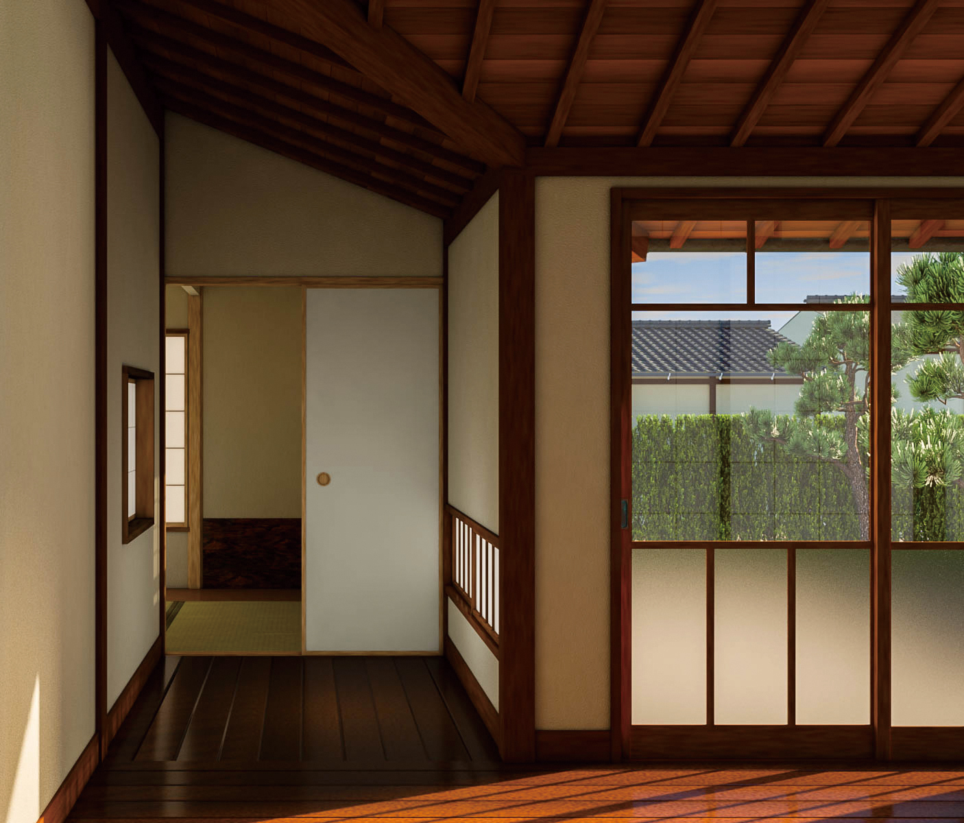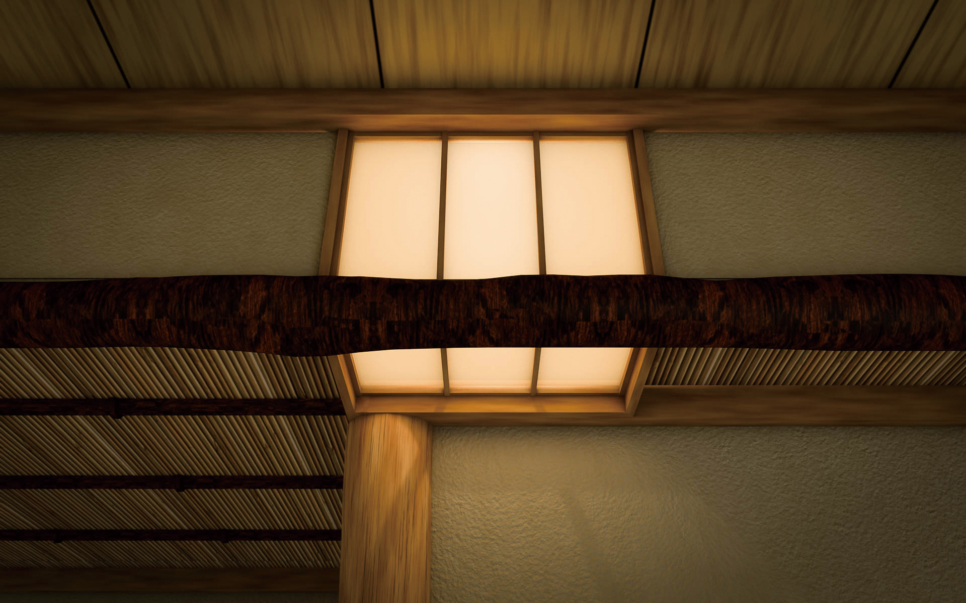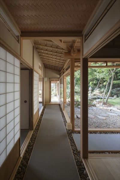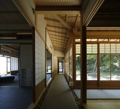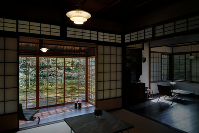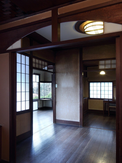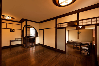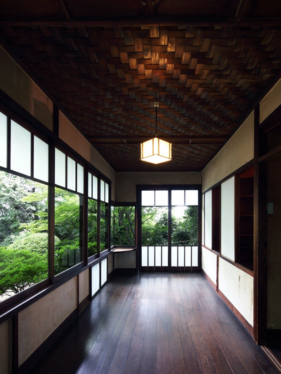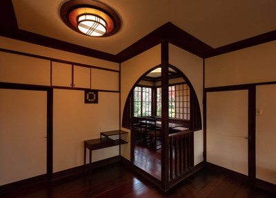 住宅采用传统的梁柱结构和土墙作为空间基础,并使用了十分前卫的水泥瓦片增加屋顶的隔热性,是藤井厚二将现代材料与历史传统相融合的一处证明。而在住宅内部,磨砂玻璃与和纸的组合使用与他的自宅有着异曲同工之妙,不仅可以捕捉瀑布花园的小景,也能用于采光通风,保持舒适的室内温度。