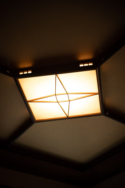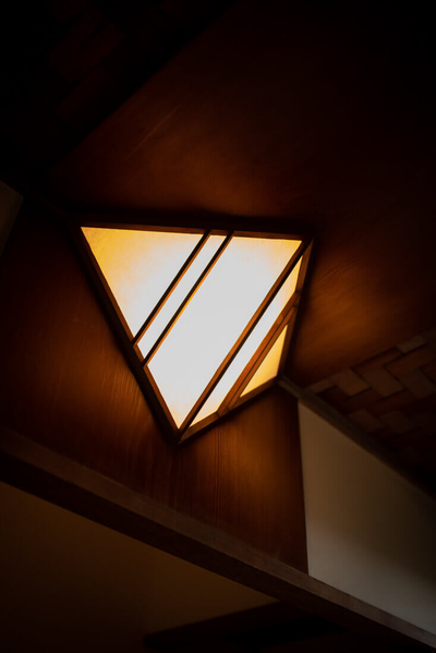 住宅的卧室采用双向布局的模式,可由入户门厅和客厅两侧进入走廊。一块雪松木板条贯穿了主卧的天花板,人字纹的编织细节与几何灯饰交相呼应,在工艺上代表着东西方的两种不同文化。正如柯布西耶、密斯、赖特等大师为自己的住宅设计家具那样,藤井厚二也完善了住宅内的所有家具、灯具以及地毯等设计细节,使之成为其理念的物质化象征。