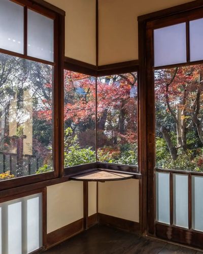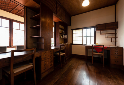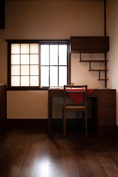 )的高度,保证坐在椅子或榻榻米上的人能够维持视线交流。而阅览室的空间则配置了在当时看来十分新潮的现代书桌与书架,并巧妙地通过和纸门窗连接客厅与阳台。