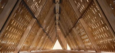 Beneath the conceptual “eaves,” layered forms echo the rhythm of traditional rooftops, building spatial depth while redefining the ceiling’s function.