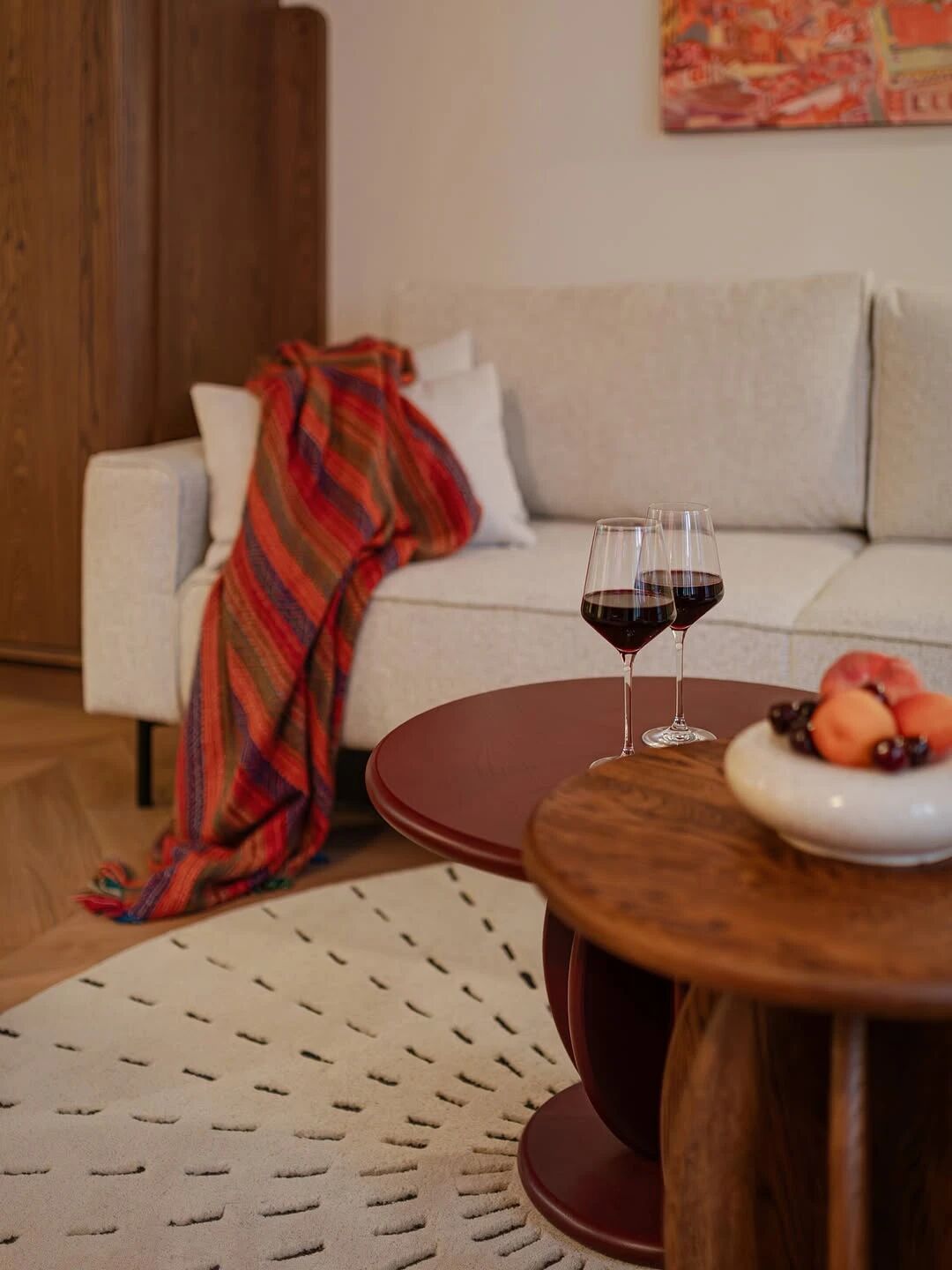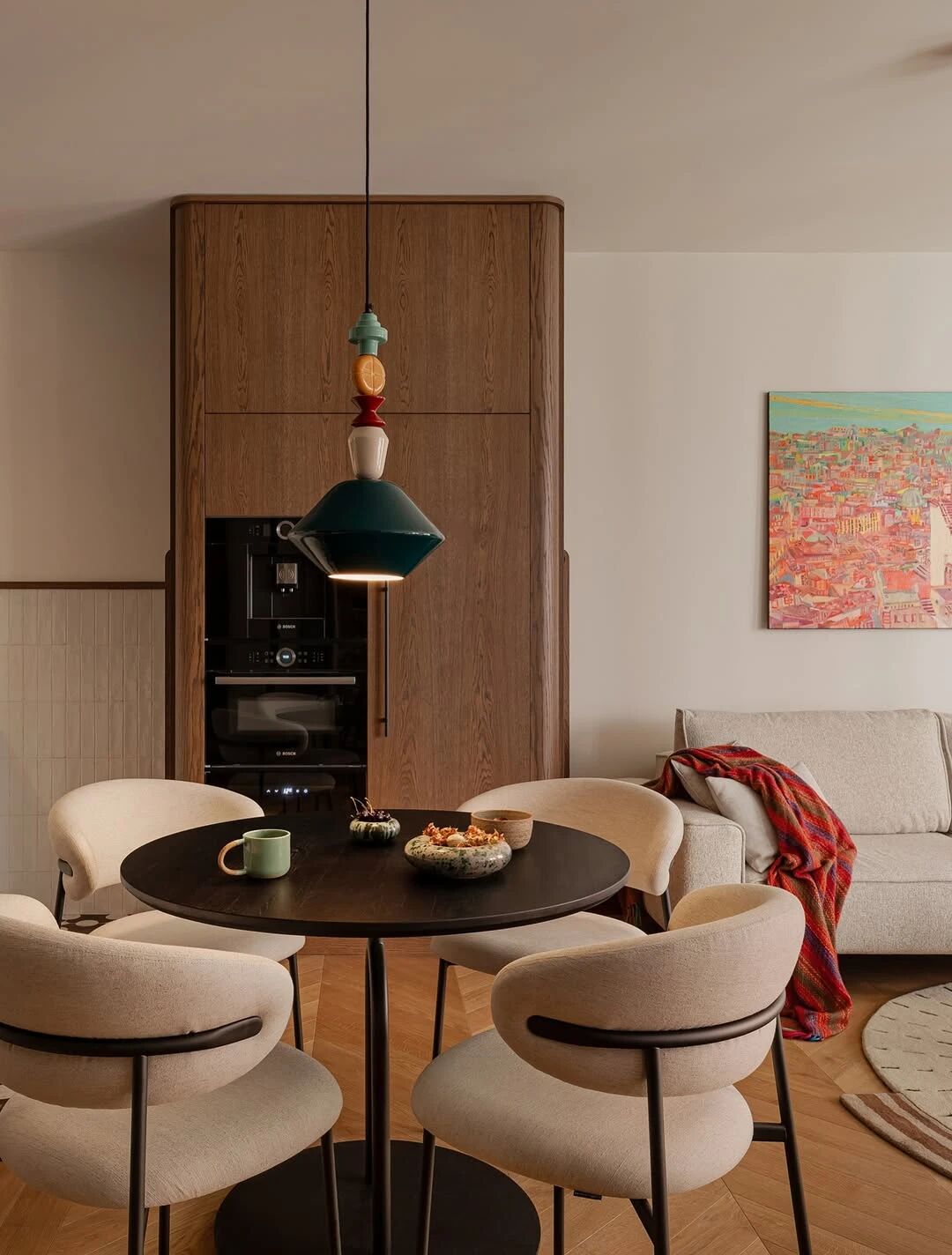 客厅配备可展开的沙发床,开放式厨房则搭配一张大型餐桌,二者共同强化了空间的开阔感,仿佛在主动邀请人们在此相聚、共享美好时光。