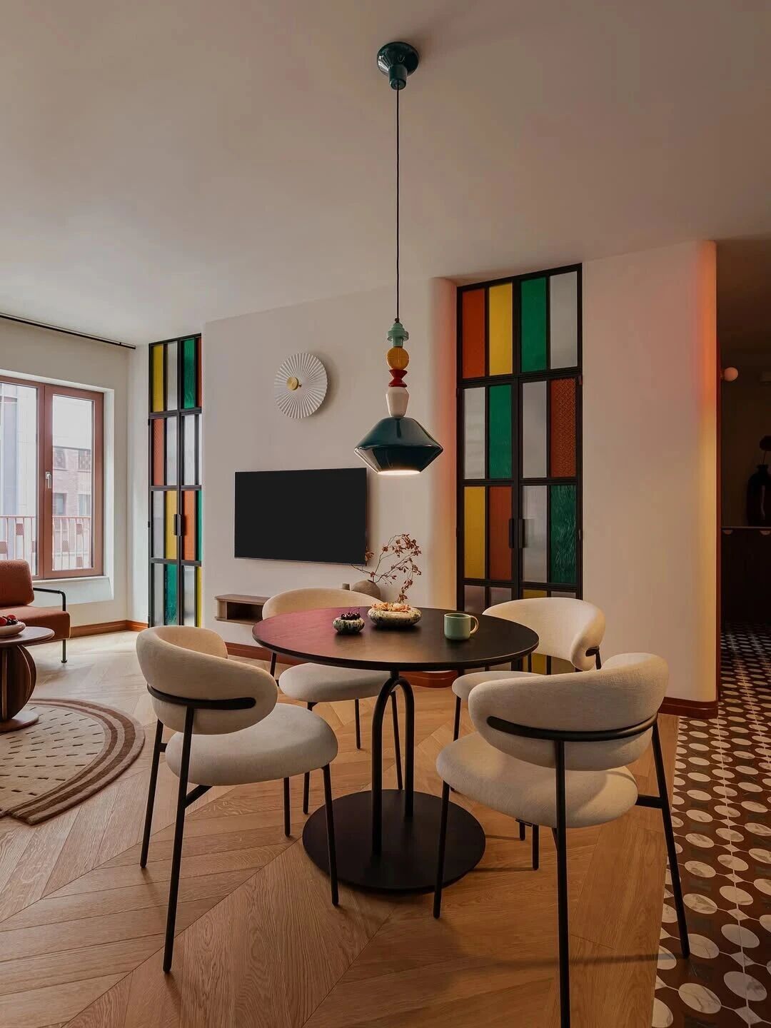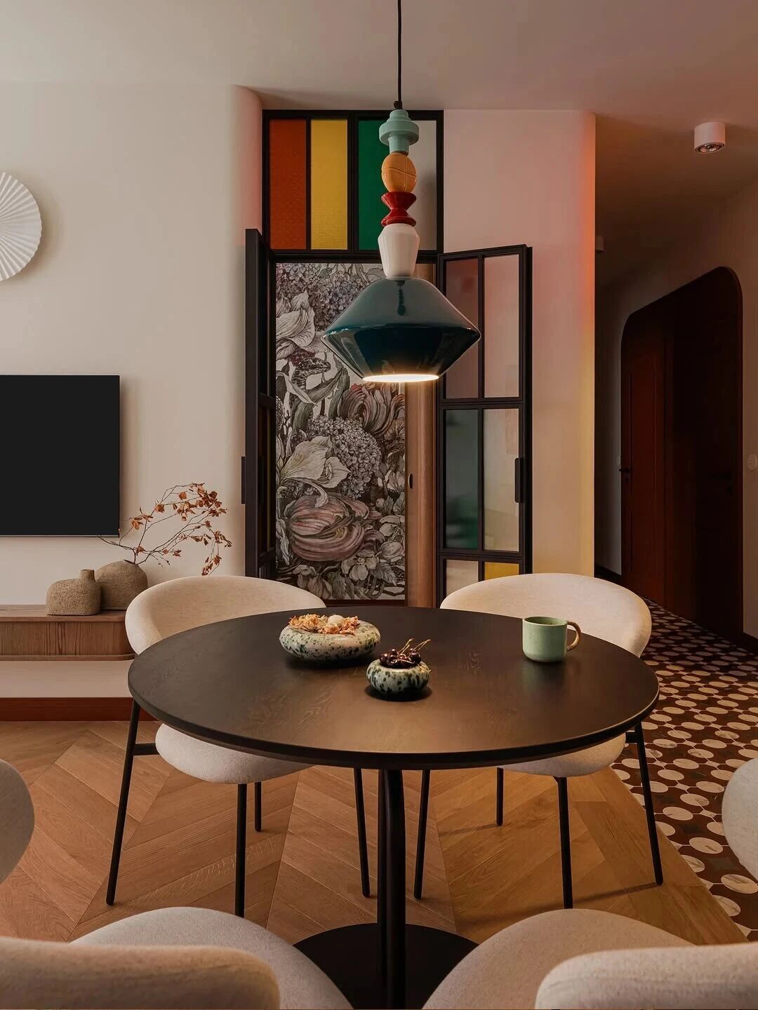 设计师以异域风情与天然材质为灵感的室内空间,将活力四射的色彩与亮点设计,同柔和自然的线条形态巧妙融合。通过精心规划墙面与嵌入式家具的连贯排布,巧妙弱化了空间中的尖锐转角,让整体格局更显流畅自然。