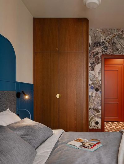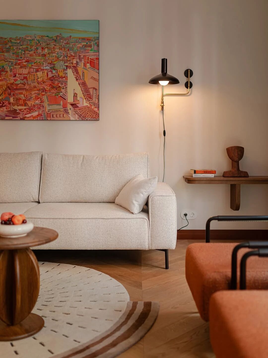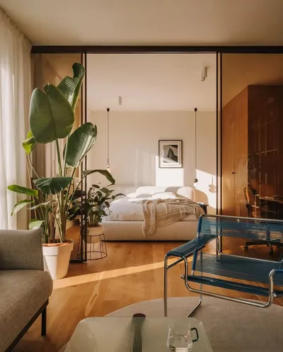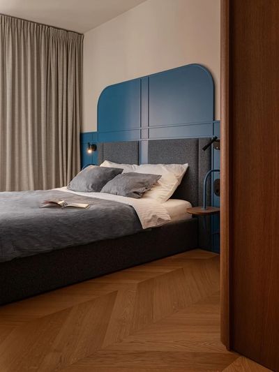 公寓需满足至少四人的居住需求,卧室中的床铺从一侧墙面延伸至另一侧墙面,同时设置两个入口通往卧室。这一设计不仅保障了居住容量,更为客厅留出了宽敞开阔的空间。