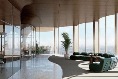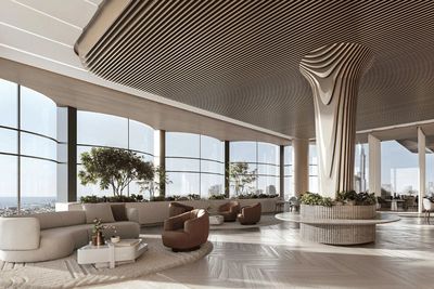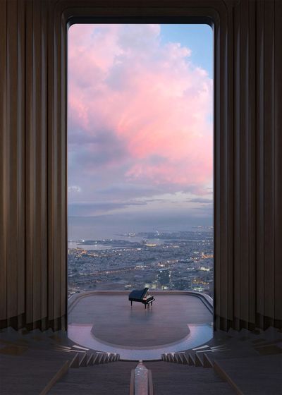 针对景观资源最佳、空间体验最独特的塔冠,设计布局超尺度 “云端剧场”。恢弘的尺度弱化了空间边界感,取而代之的是远眺海湾与诸多城市地标的无界感。这里,将吸引高端企业发布会、云端社交聚会、空中音乐会等城市事件发生,成为项目甚至城市的活力引擎。