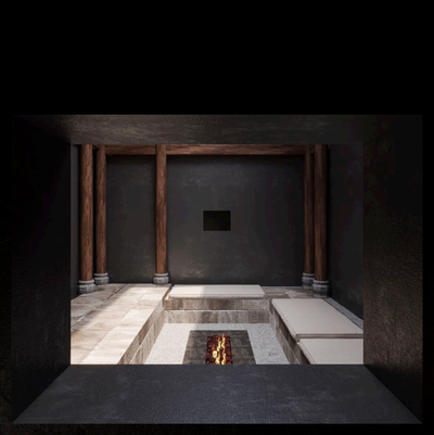 The courtyard serves as a space to observe the relationship between architecture and nature from the outside looking inward. Whether gathering around the fireplace or pausing in reflection before the artworks, visitors experience time as layered — moving between opening and closing, light and shadow.