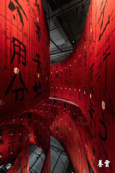 在主楼负一层,作品【孝经】以红色绸缎为载体围绕着四圈椭圆形轨道布置,巴比伦塔形状的丝绸在镜面玻璃的倒影中形成视觉延续,构建了震撼的视觉感官体验。