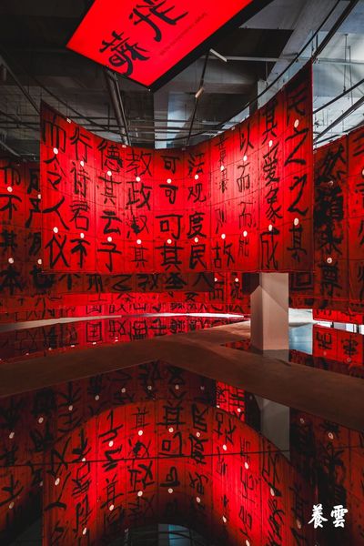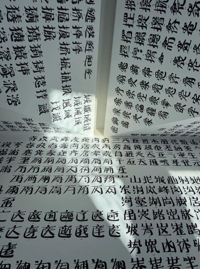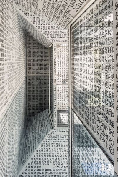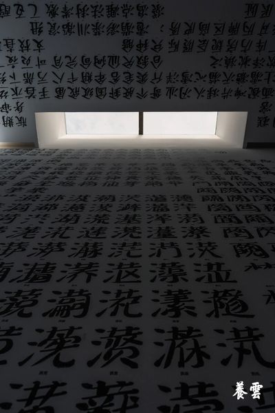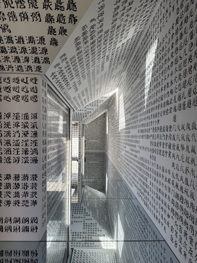 The North Gallery presents the work Jiǎntǐ Cí, where twenty thousand simplified Chinese characters line the ceiling and walls. A mirrored glass floor reverses and magnifies their reflections, extending the visual field beyond physical boundaries.
