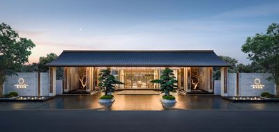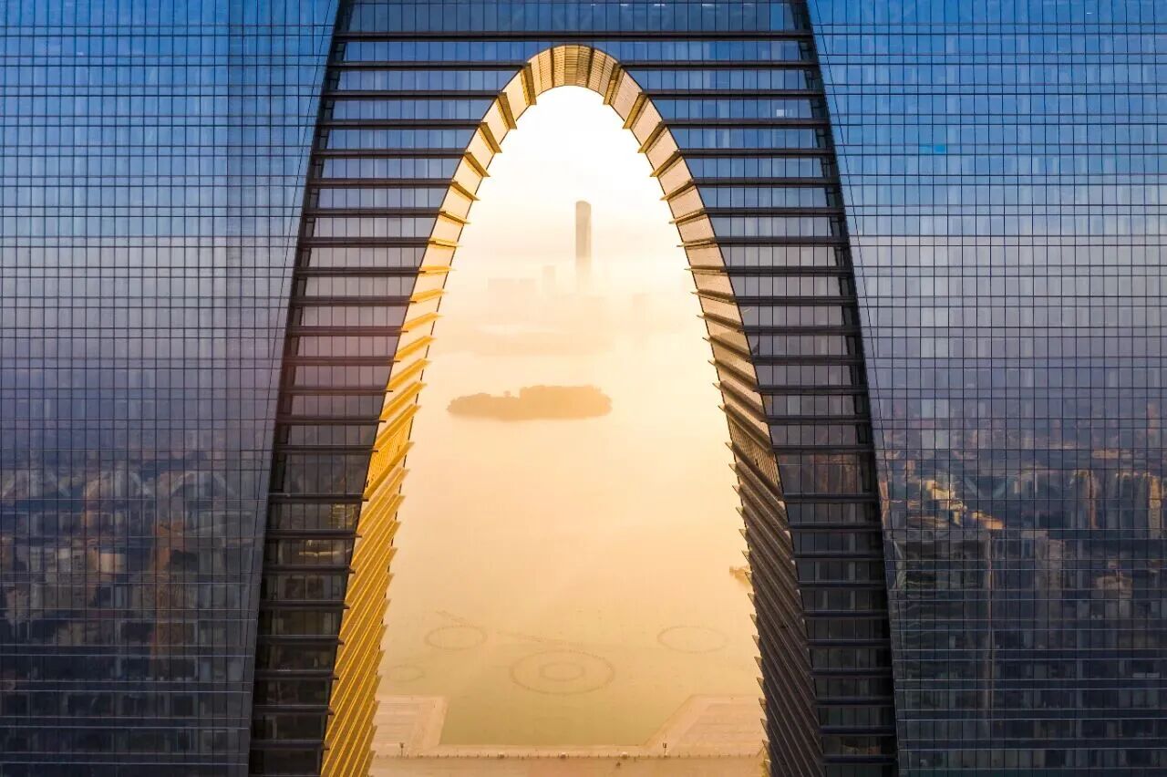 景泰蓝垂幕旒珠振玉镶嵌其间。整体建筑则延续东方屋檐的优雅曲线,以三曲面造型勾勒出灵动天际线,在曲线流转间编织出东方气韵与当代精神。