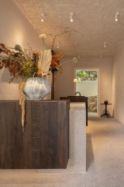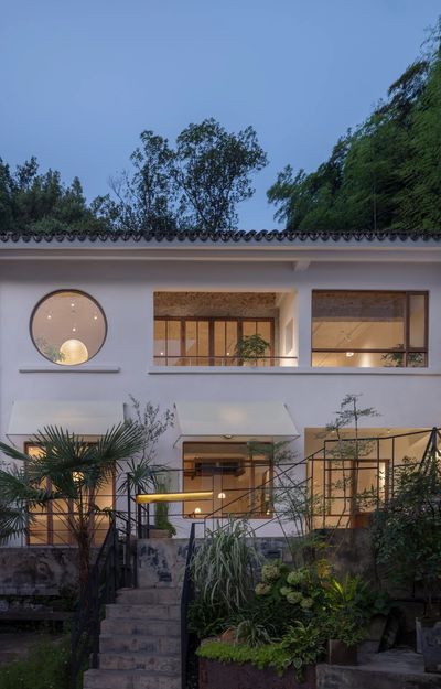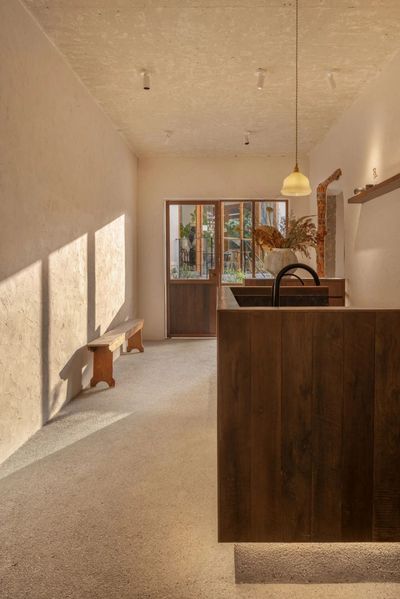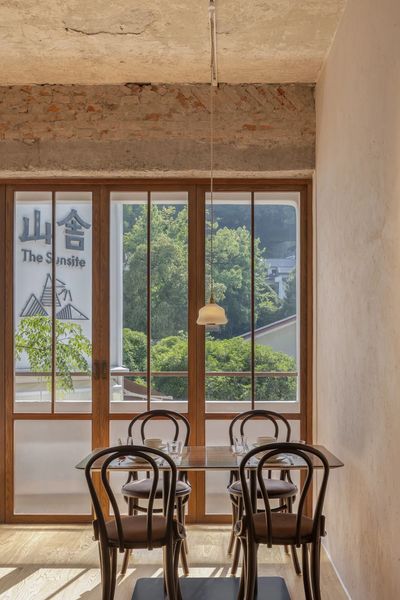 粗腻子粉刷的墙面,原始水泥预制板的天花,局部裸露的红砖及现浇水泥柱,工人偶然敲击形成的不规则门洞,原始客房一楼的挂画、老门,裸露的风管机空调,闲鱼淘来的旧玻璃灯罩、黄铜拉手等等,这一切看似“老、旧”,但都是在秉承“美“的前提下、通过精挑细选而形成的品味与调性。