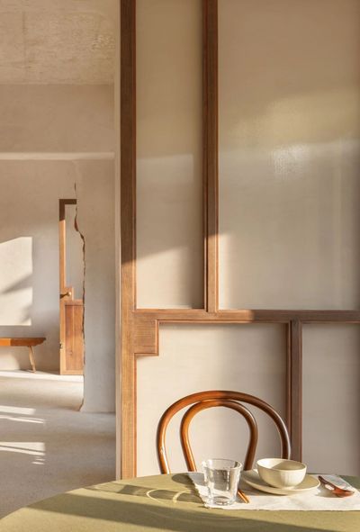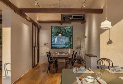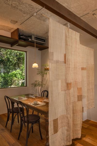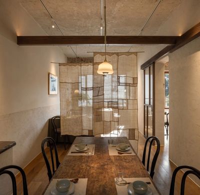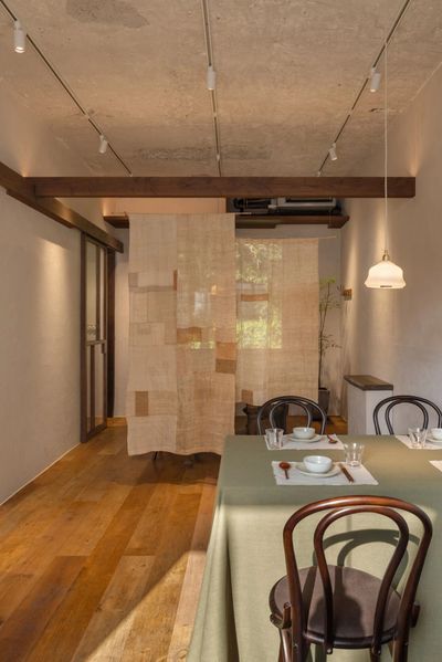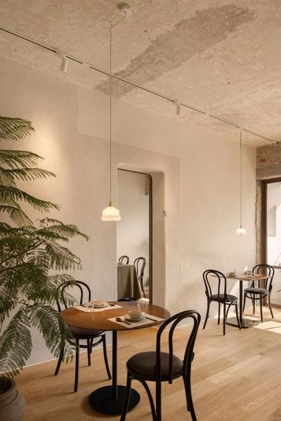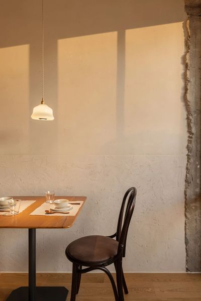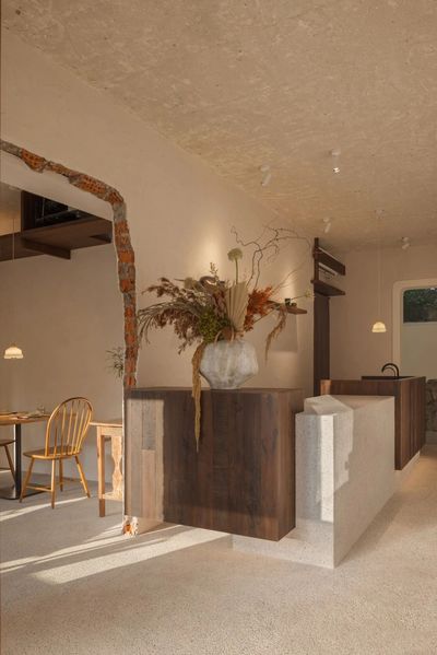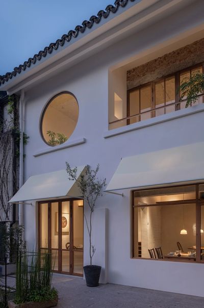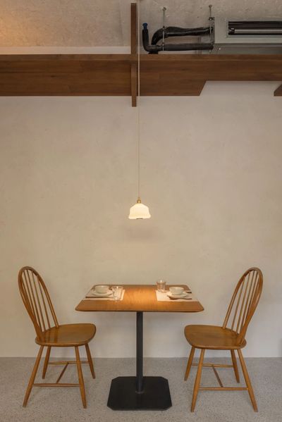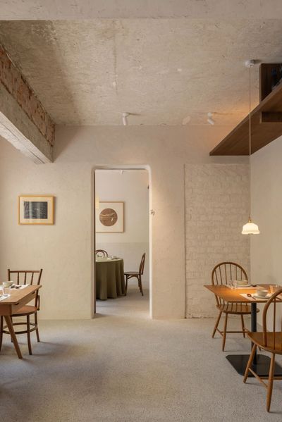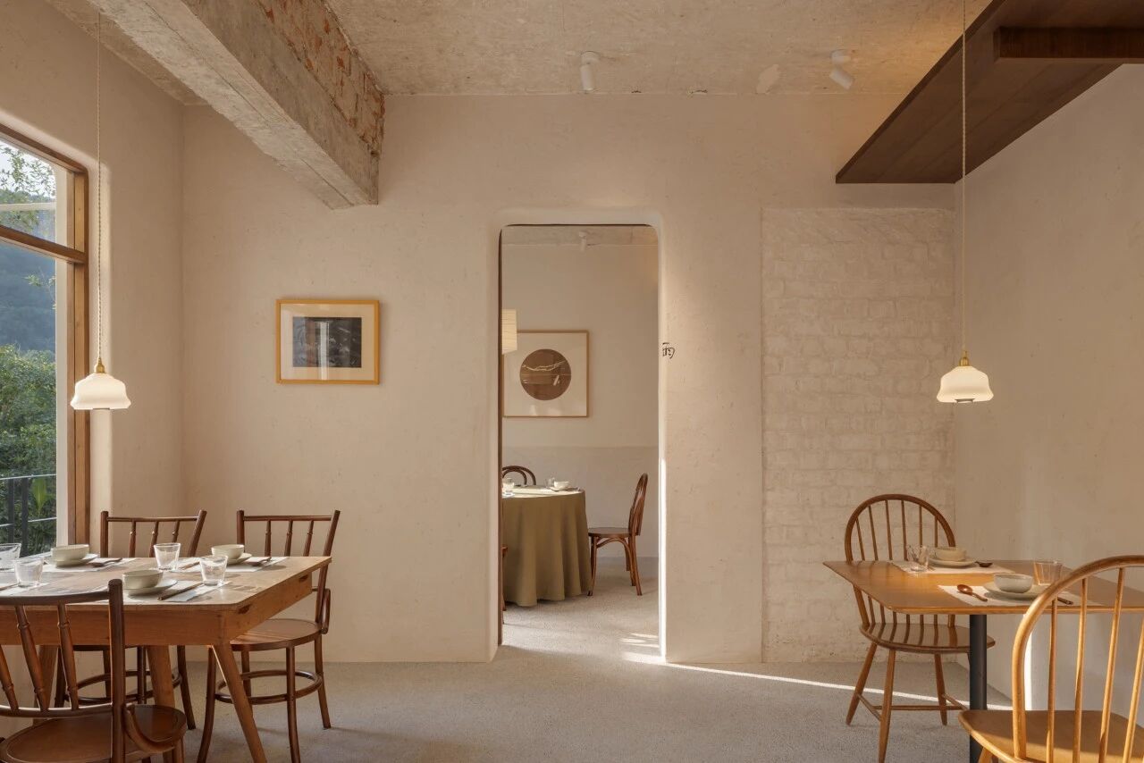 餐厅上下两层,前身是家5间客房的民宿,业主希望可以部分保留原有的“时间肌理”,并植入新的餐厅功能。