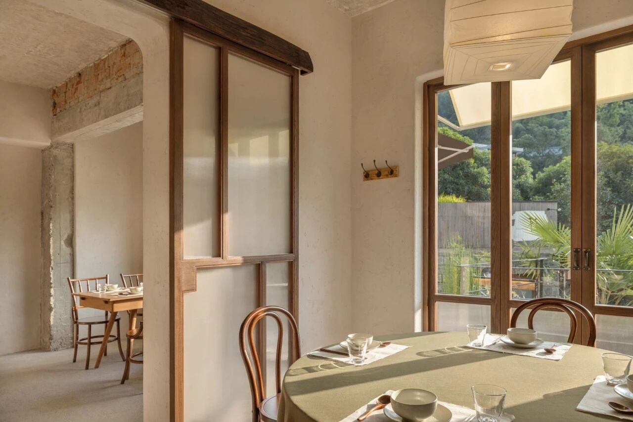 打开原民宿的设计方案,我们顺着原建筑的结构摸索,在尽量不变格局的基础上,在原始客房隔墙上开出几处必要的门洞、用于餐厅动线和视觉秩序的梳理。同时,拆除不受力的多余隔墙,将空间最大限度开放,后续使用软性隔断手法作为区域的划分。