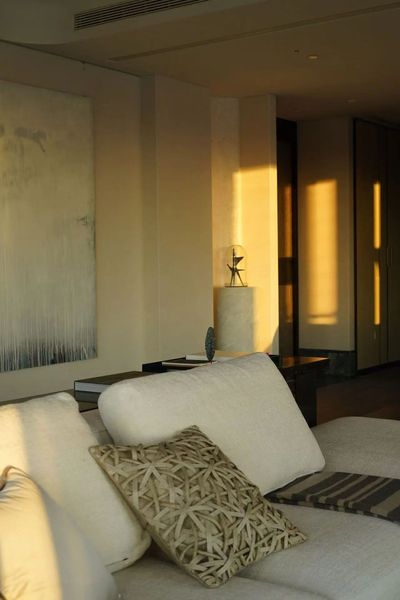 面向墙面的部分我们不做过多的装饰,而是让不同时刻的光线从阳台和落地窗中照亮室内,从而强化空间的层级分级以及生活的仪式感。