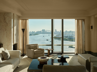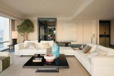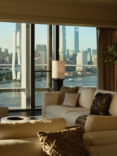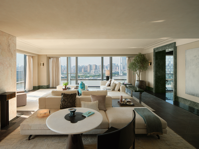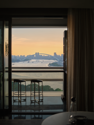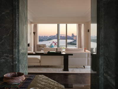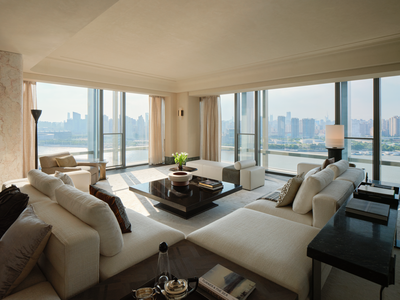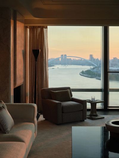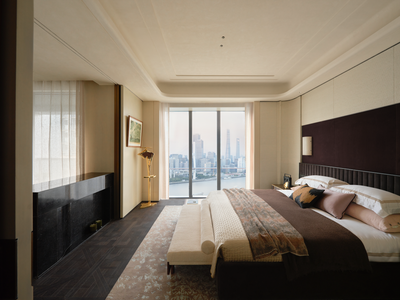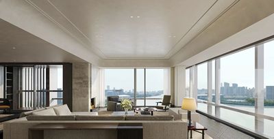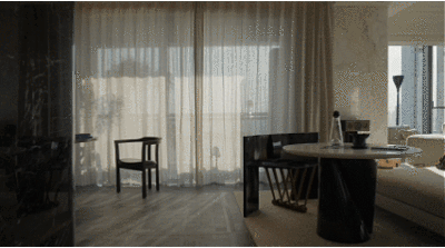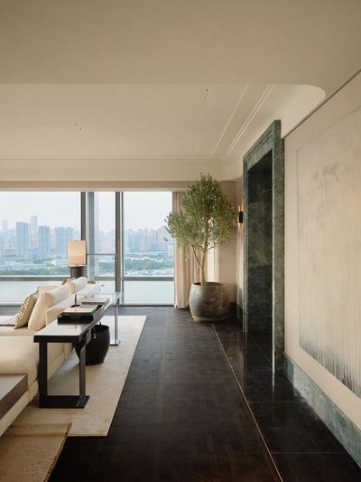 步入室内,客厅以外部景观为根本发展行为和应对居住者的情绪。设计则以“退隐”的姿态,将空间“还给”最昂贵的资源——那一扇窗,以及窗外无法复刻的一线江景。