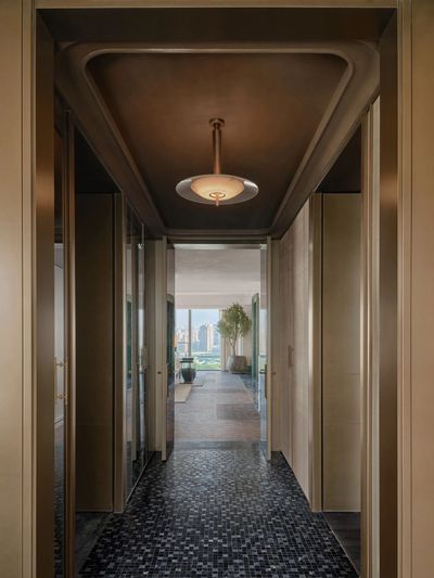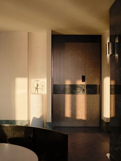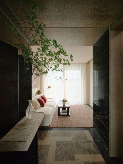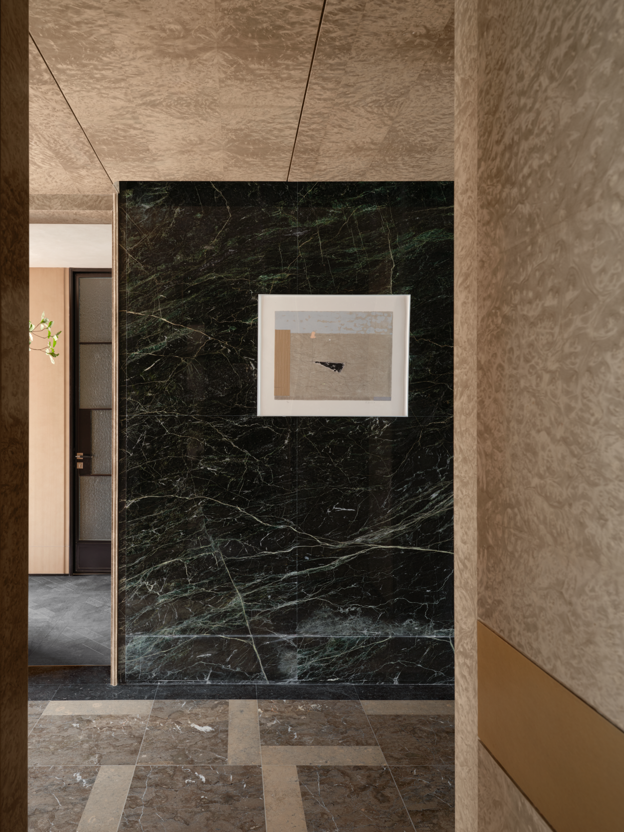 电梯厅是内部空间的核心动线,由两端的入户门分别可以进入客厅与餐厅。设计通过玄关地面以及墙面材质的拉通,弱化电梯的存在感,将电梯厅私属化,模糊了公共空间和家庭私人空间的边界。而这种由动线优化生成的“自由感”则进一步强化了边界上的模糊,让电梯厅得以转变为“家庭走廊”的存在。