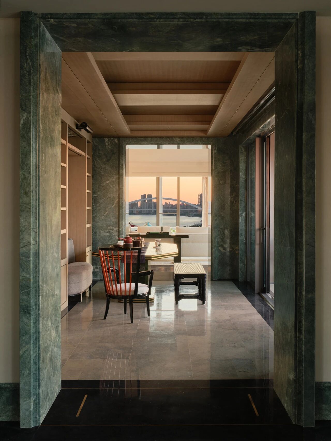 门套也是建筑手法引入室内的关键要素,同样也是大块面材质的延伸。在不同空间的过渡上建立秩序和仪式感,帮助统一空间的整体视觉体验。