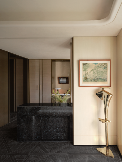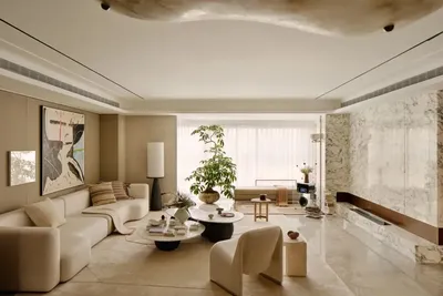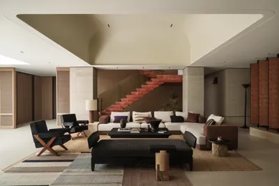 其一,设计剥离传统豪宅追求繁复装饰与强调空间分隔的构成手法,而是回归空间的本源,即:“人如何在其中生活”。以抽离设计师的“第三者”视角观看空间整体,通过“模糊空间边界”的大块面处理,建立一种内在的、宁静的秩序感。