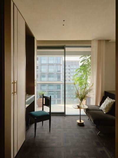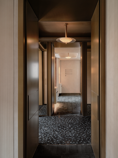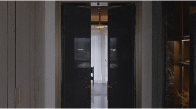 主卧在空间关系上,与公共区域既联通又保持私密的状态。使用电动门作为空间转换,不仅帮助动静区域之间形成交界关系的区分,同时也是居住者舒适体验的一部分。而门后内玄关的设计上,团队使用一种特殊的处理,就是内玄关“衣帽间”化,让整个主卧产生独立感。