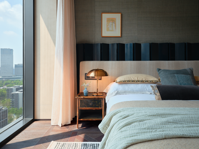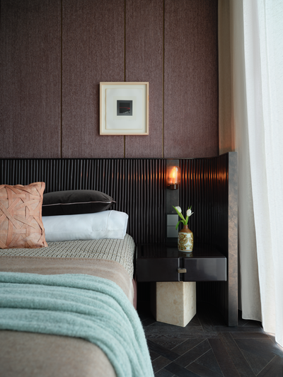 次卧在风格上延续静区整体的连续性,但通过竹编、大漆等特殊工艺,让每个卧室都拥有自己的独特感受。同时,次卧并非功能固化的房间,当只有夫妻二人时,我们希望有连接感的次卧可以成为不打扰对方的“第二睡眠区”,而当家庭成员逐渐丰富时,这里也可以成为贴近父母的儿童房,让空间得以温柔地承载生活的演进。