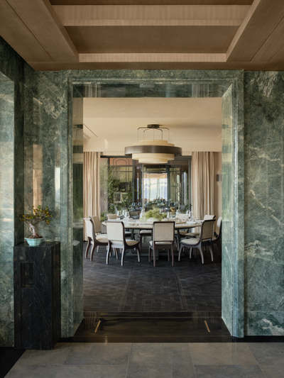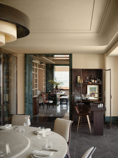 而在空间构成上,则以人与人之间的互动方式为根本,去形成布局的构建。整个宴会厅的中心是可容纳10人位的圆桌,门套与落地窗的交界处则通过展示柜和吧椅的组合,独立出一隅可以小酌的吧台。