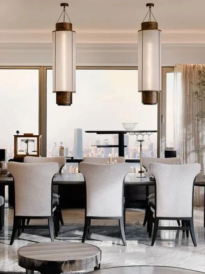 其二,得益于户型中的360°玻璃幕墙与直面黄浦江一线的江景,让空间可以最大限度的引入自然光线,并成为塑造氛围和情绪的主角。因此,团队在所有能看到外部景观的立面上都不做装饰性的雕琢,以偏建筑语言的手法去构建。