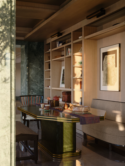 ○宴会厅与客厅之间的被打造成了可以观景的书廊,一侧是观景阳台,另一侧则以意大利品牌Dal Vera的孤品八角桌作为聚焦点,可以品茶、阅读,享受家人聊天或者自己放松的时刻。