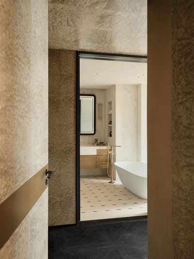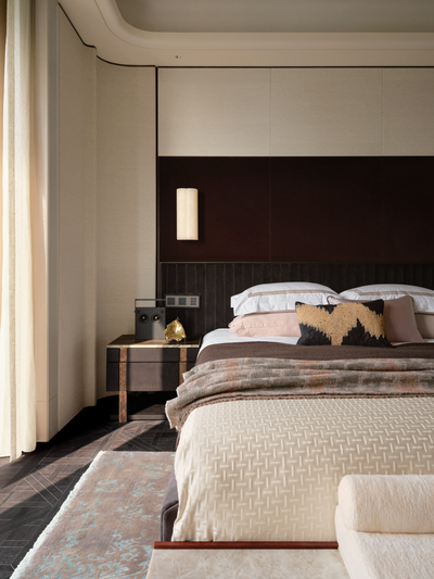 主卫、衣帽间与卧室主体的地板均使用不同材质和拼花手法,以此强调不同功能区域的生活形态转化。