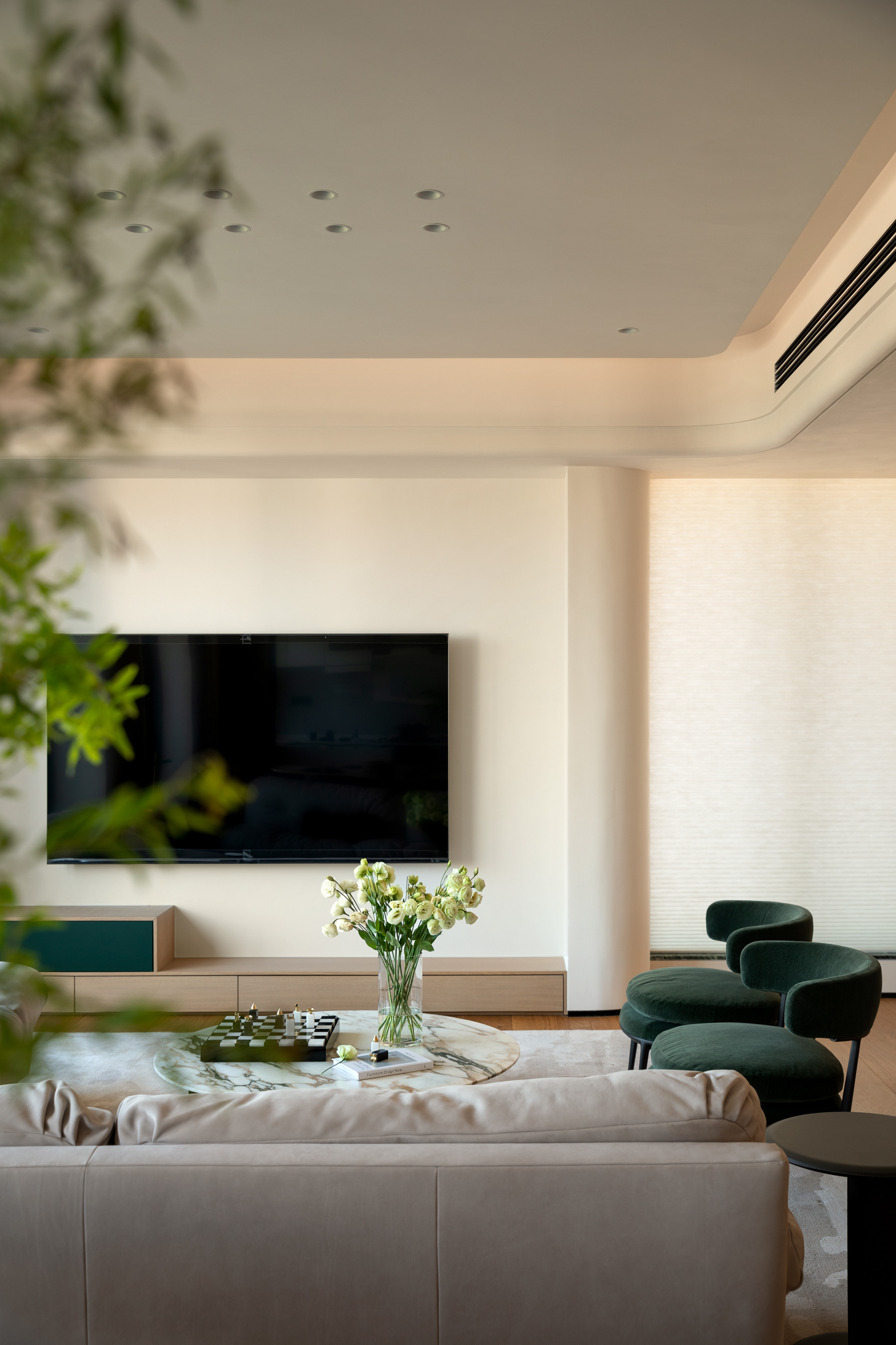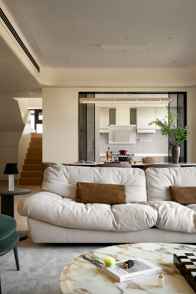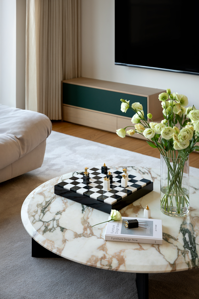 的大理石茶几,台面光滑流转天然纹理,低调中不失精致。圆弧造型柔化了空间轮廓,也与沙发柔和的曲线彼此呼应,在实用功能之外,成为一件自然而优雅的客厅艺术品。
