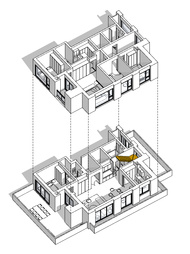 空间的功能性通过上下、南北的细腻布局从容铺展,每一块面都承载着独特的生活场景。楼梯不只是简单的交通枢纽,而是化身为一场精心构建的光影艺术。设计师于楼梯转角处匠心融入一处