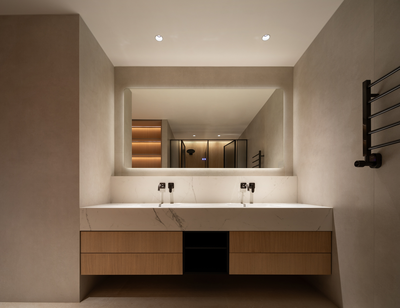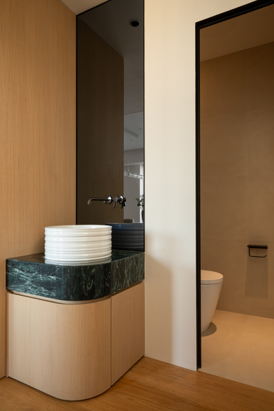 悄然点缀于酒柜与洗手台面,似将山水凝固成诗,在灯光下泛起朦胧青霭。它们与