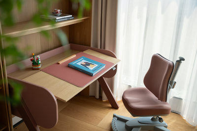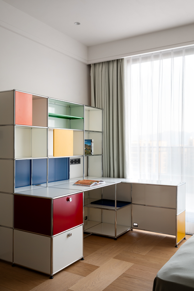构建书柜与书桌,灵活可调的层板设计不仅适配不同阶段的收纳与学习需求,其鲜明的色彩和精致金属质感,也成为空间中一抹轻盈而充满活力的点缀。