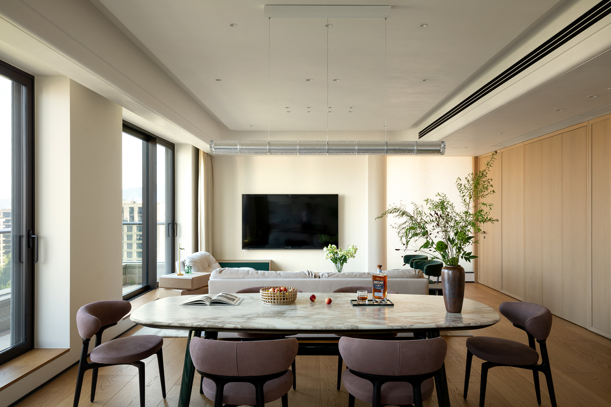 的天然优势。设计师以几乎占据整墙的超大玻璃窗,极大消弭了室内外的视觉界限,将城市天际线温柔纳入日常。居住者安坐客厅,亦可一览无余,感受天空、建筑与光影的无界对话。