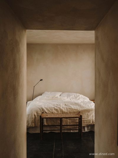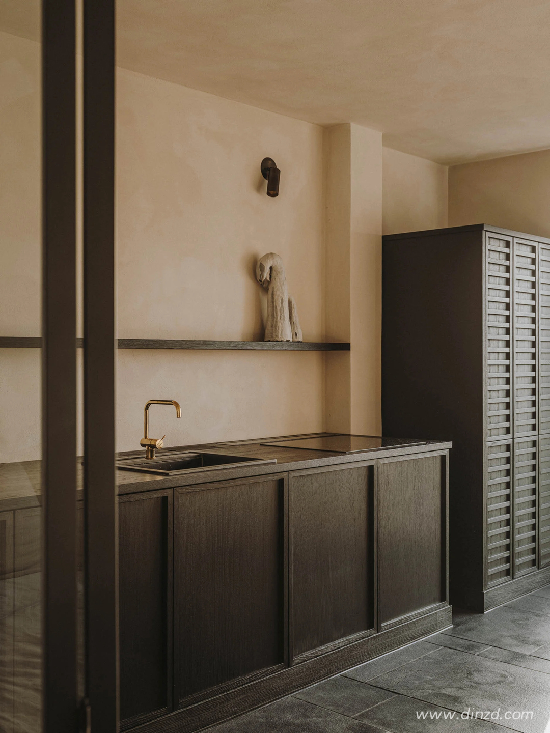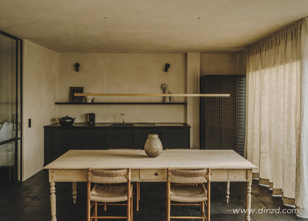 尽管采用开放格局,顶层公寓的材质谱系却以深邃迷人的色调统领全局。“深色系让空间在夏季保持清凉感,并以粗犷的奢华营造 sensual 氛围,”埃瓦阐释道。染色石灰岩墙面、黑石地板与深色木制橱柜构成质感交响,恰似雅典城市肌理的微缩映照。