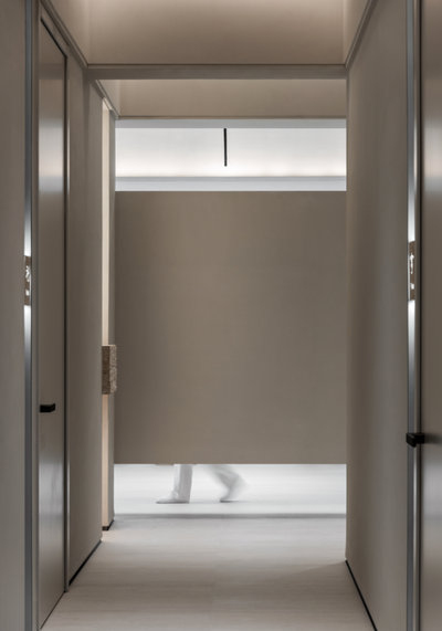廊道,是空间的韵律,更是一场精心编排的“光的修行”。我们效仿路易斯·康对光的崇敬,构建“见光不见灯”的精密秩序。光线被墙体切割、引导,在路径上投下随时间移动的光之画卷。明与暗,非对立,乃共融。行走其间,视觉跟随光影的节奏经历一场洗礼,渐次剥离外界纷扰,步入内观的心境。
