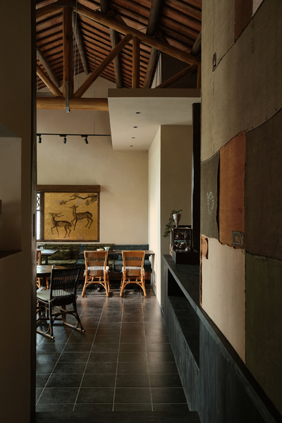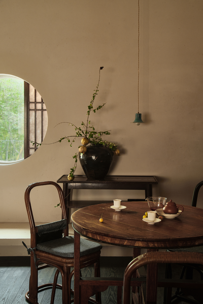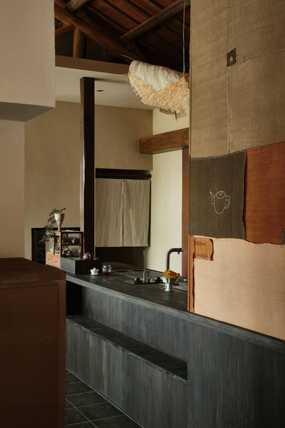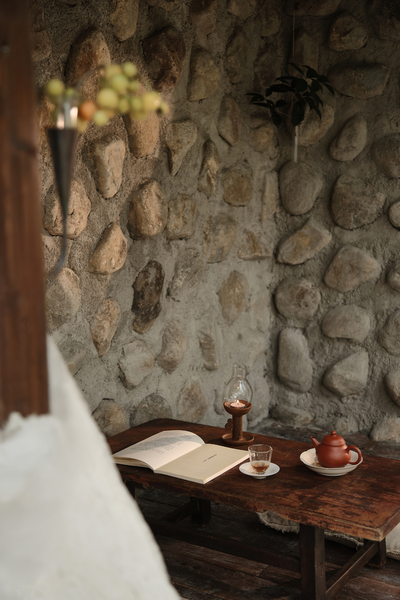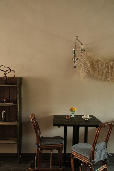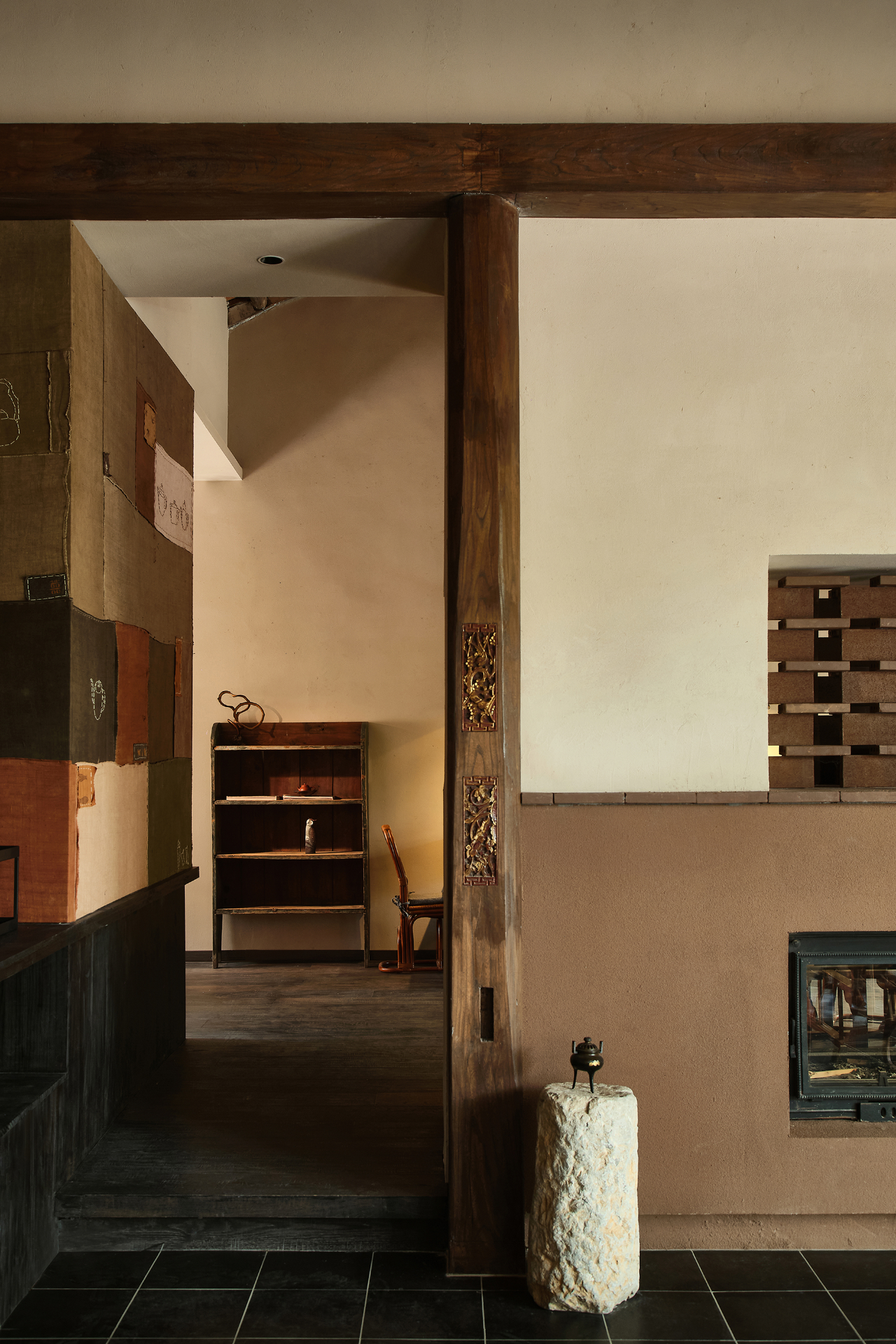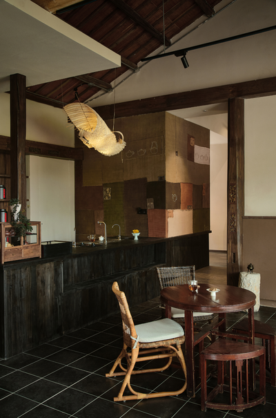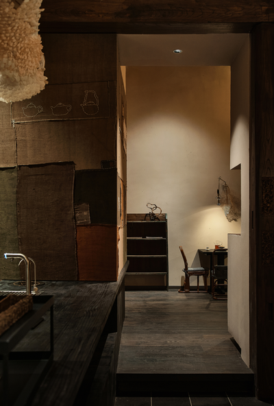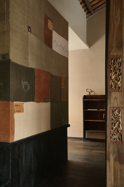 嵌入花板的老木头梁柱与收集来的老布彼此融合,乘物游心,它们与室内的老家具共同赋予了空间中的古老灵趣。人们对一处景致的沉浸与玩味,实质上是人们在建筑空间中寻求自我认同和情感寄托的过程。