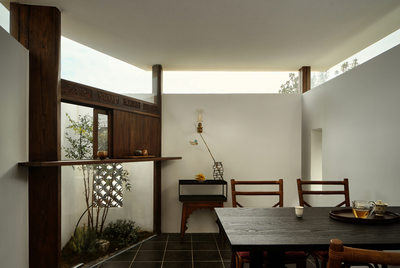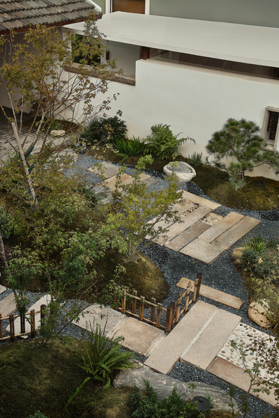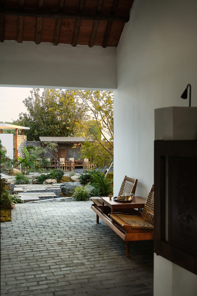 前院至建筑的一侧由植被坡地蜿蜒成两条路径,一条通往工作区,另一条连接侧院直通后院的茶馆。我们将侧院入口的建筑立面打开,把原本位于室内的区域置于室外,使它成为连接两个院落的通道,引导呼吸与停留。