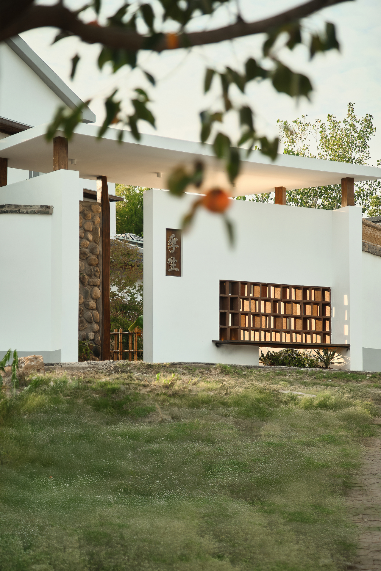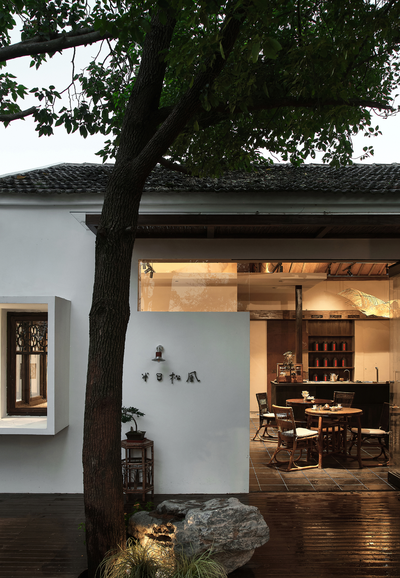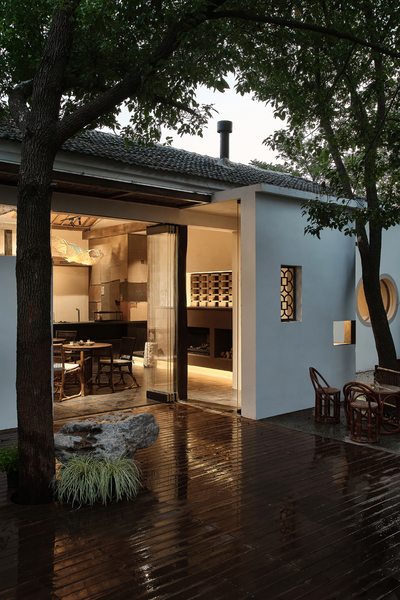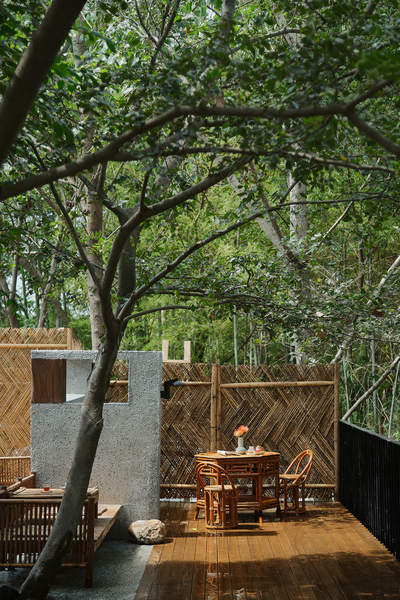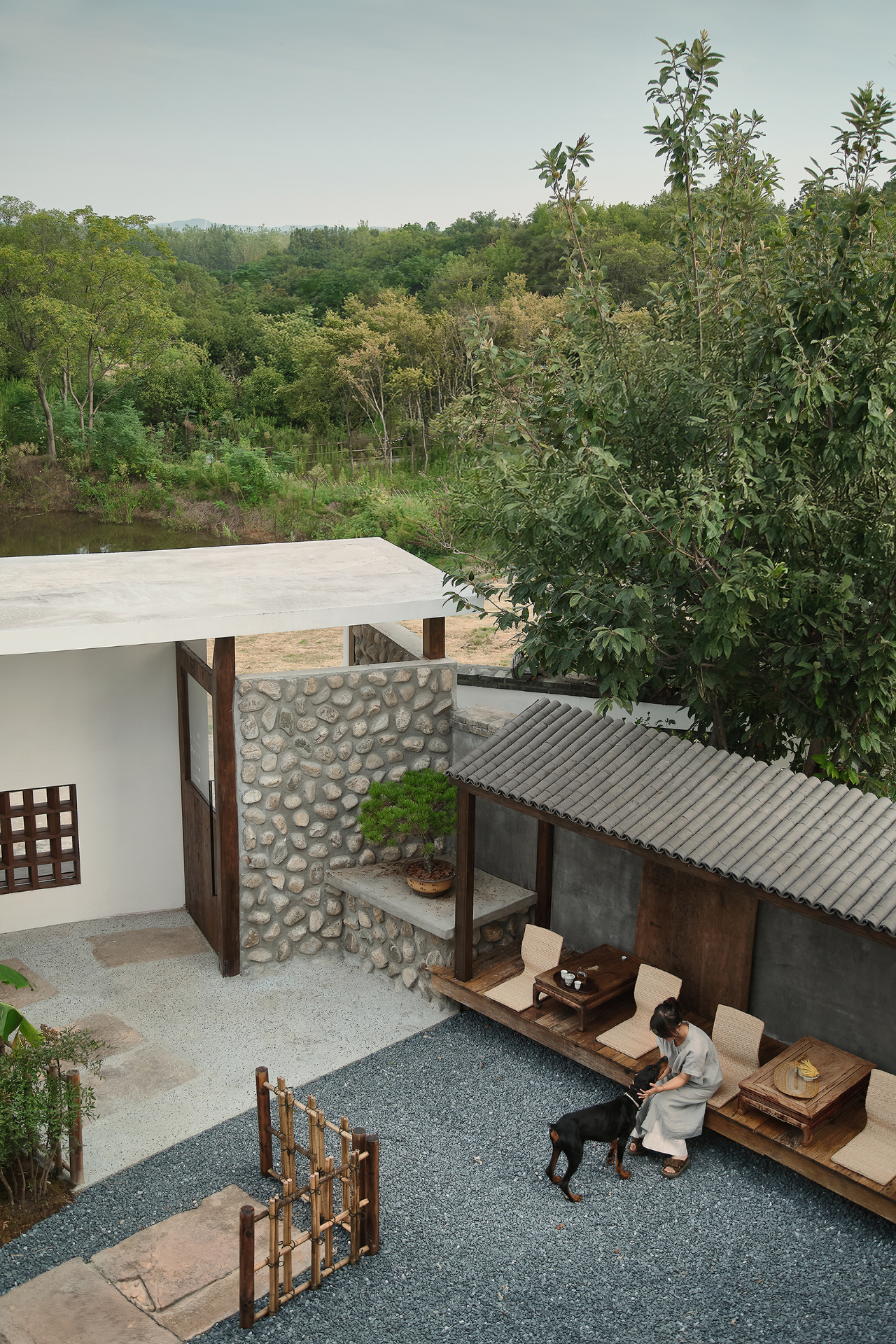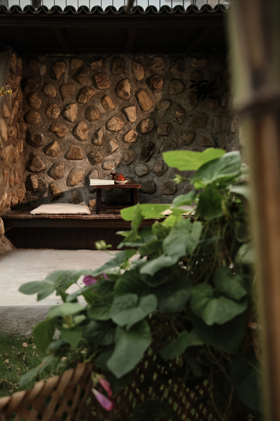 填平后的平台与北侧的竹林形成拔地而起的姿态,创造出一种垂直向上的空间张力。同时利用原本场地中五棵树的界定,分出了围墙区域、庭院小景和休息区,从而制造出一些水平游移的视点。以树来界定人物活动,它提供了自然的边界和参照,而人终究是自然的尺度。