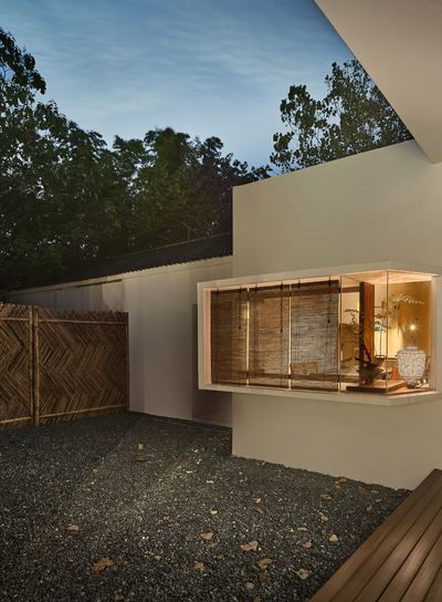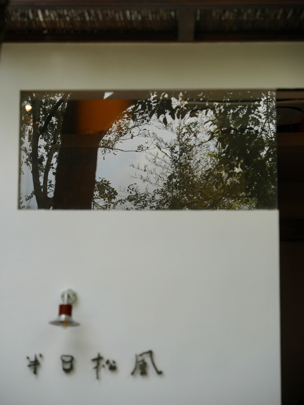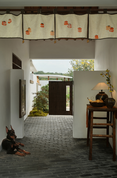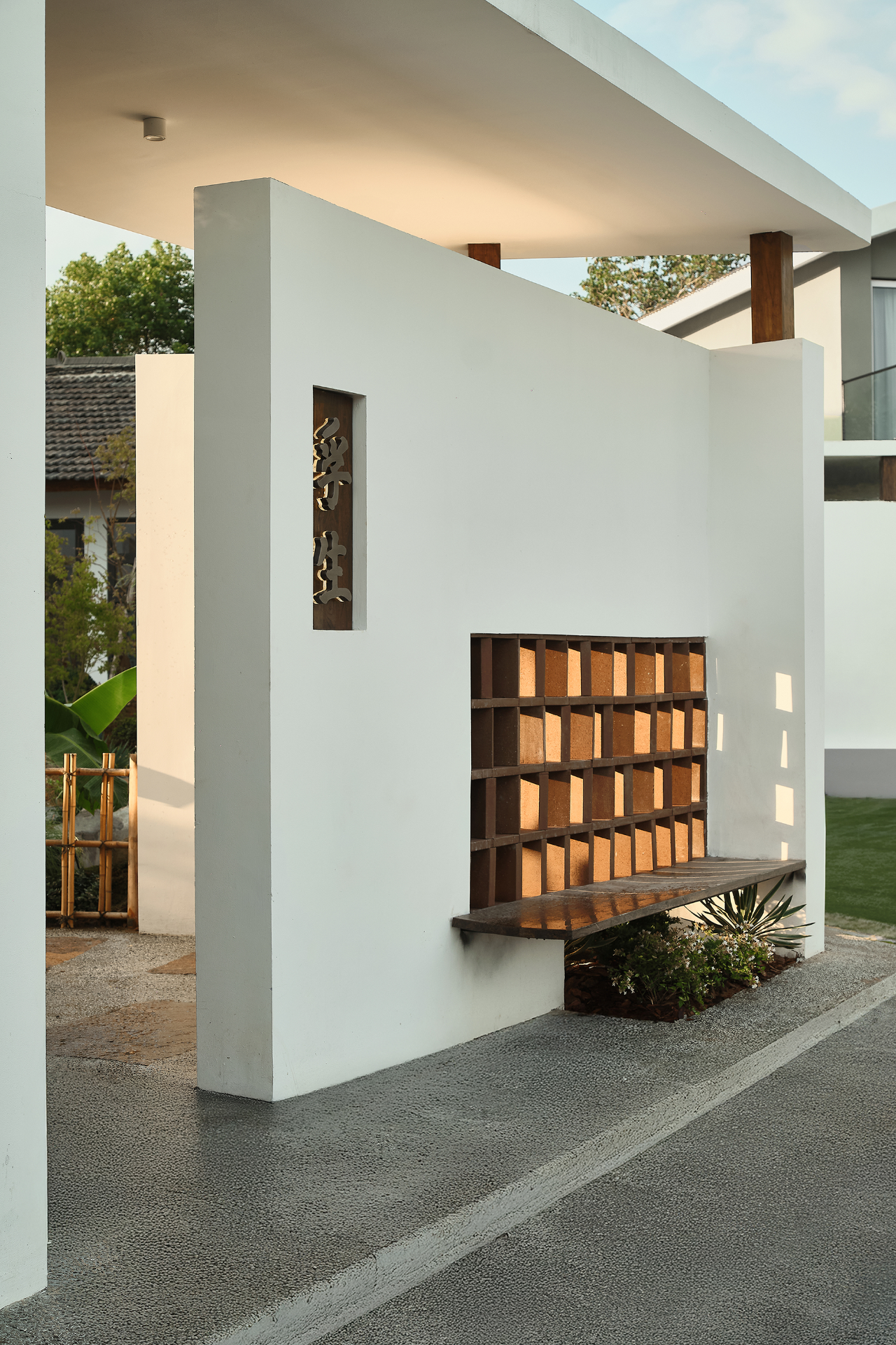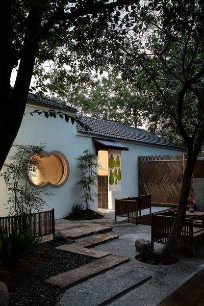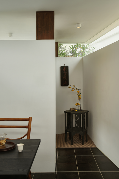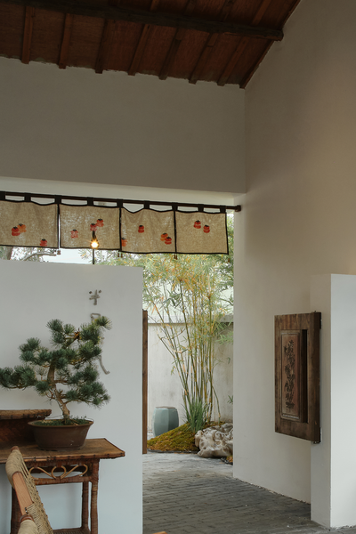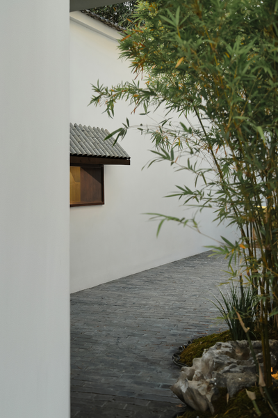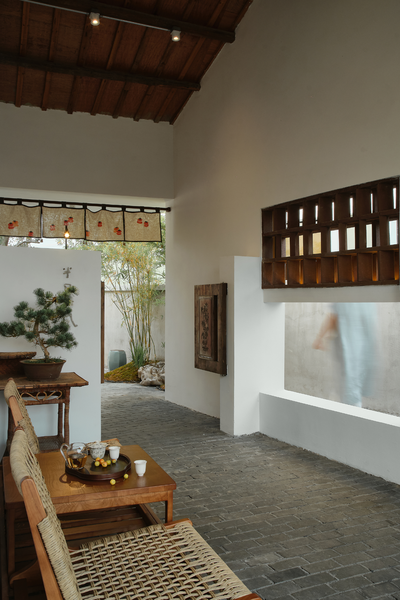 通道东侧另设一条小径通往一旁的小茶室,小径入口处以两丛竹子留出宽不足米的间距,营造茶室的半遮敝性。中间墙体以局部镂空窑砖打开,又袒白了这条复廊的存在。