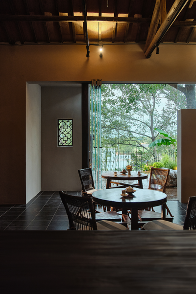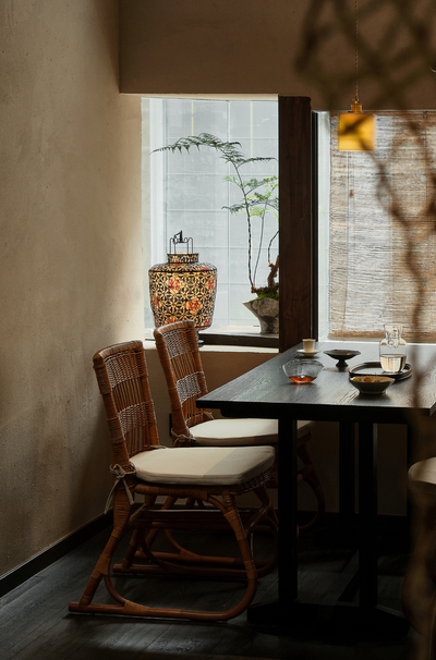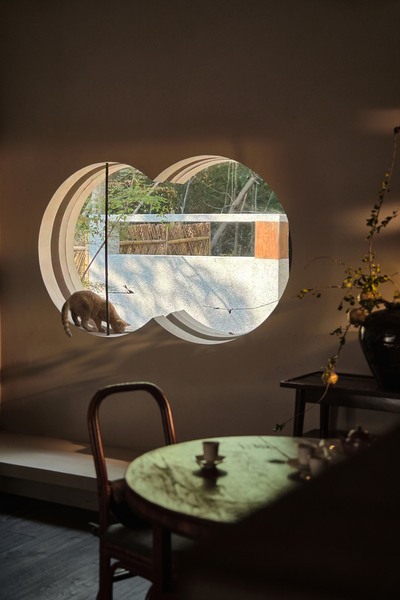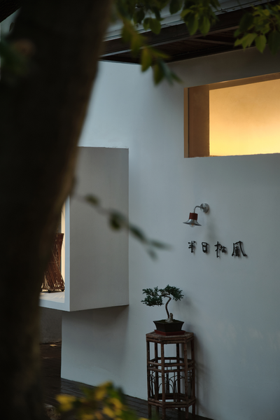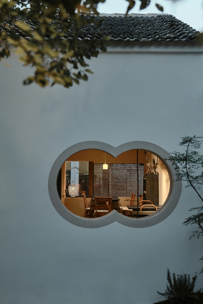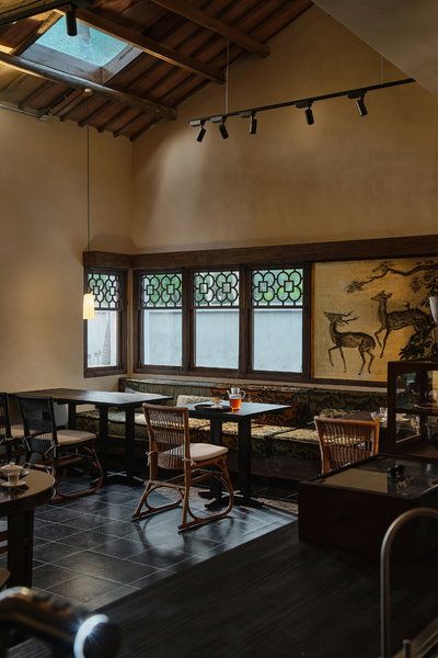 茶馆位于建筑北隅,其形制为坡顶双开间之格局。几处窗景以深檐口温柔包裹,既过滤掉室外强光,也确保了窗户外展的安全性。洞口内侧嵌入花格窗棂,成为捕获窗外景物的多变界面。坐于室内,光影斑驳。当人与外界进行生动的互动体验之时,才能让人理解并确信,内在的诗意营造可以超越物理的边界。